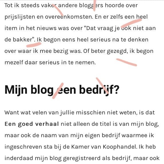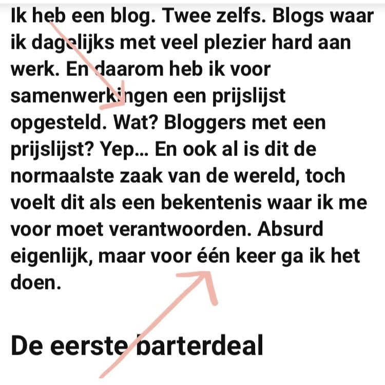 Maar bij een ander artikel gingen alle alarmbellen af. Toevalligerwijs (?!) 13 dagen na mijn artikel over Bloggers met een prijslijst, zet deze dame een artikel over hetzelfde onderwerp online. En toen ik het las, zag ik het meteen; ze heeft gewoon delen van mijn tekst letterlijk overgenomen! Kijk maar eens naar onderstaande voorbeelden. Dit kan toch geen toeval meer zijn?