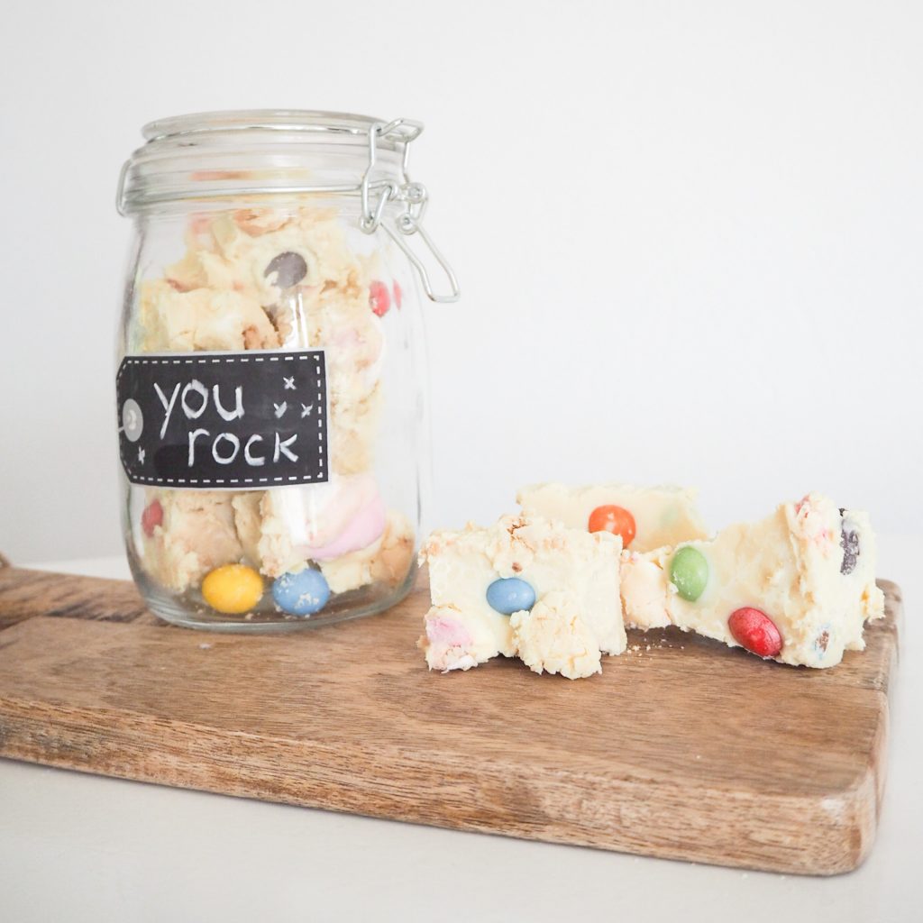 Al snel bedachten we dat een pot vol lekkers toch wel heel leuk was om te geven. En aangezien Noah Joe zelf gek is op Rocky Road – en dan met name van witte chocolade – moest dat het worden. Deze Rocky Road bestaat uit witte chocolade, m&m’s met pinda, spekjes en theebiscuits. Een smakelijke afscheidscadeau voor de meester, toch?