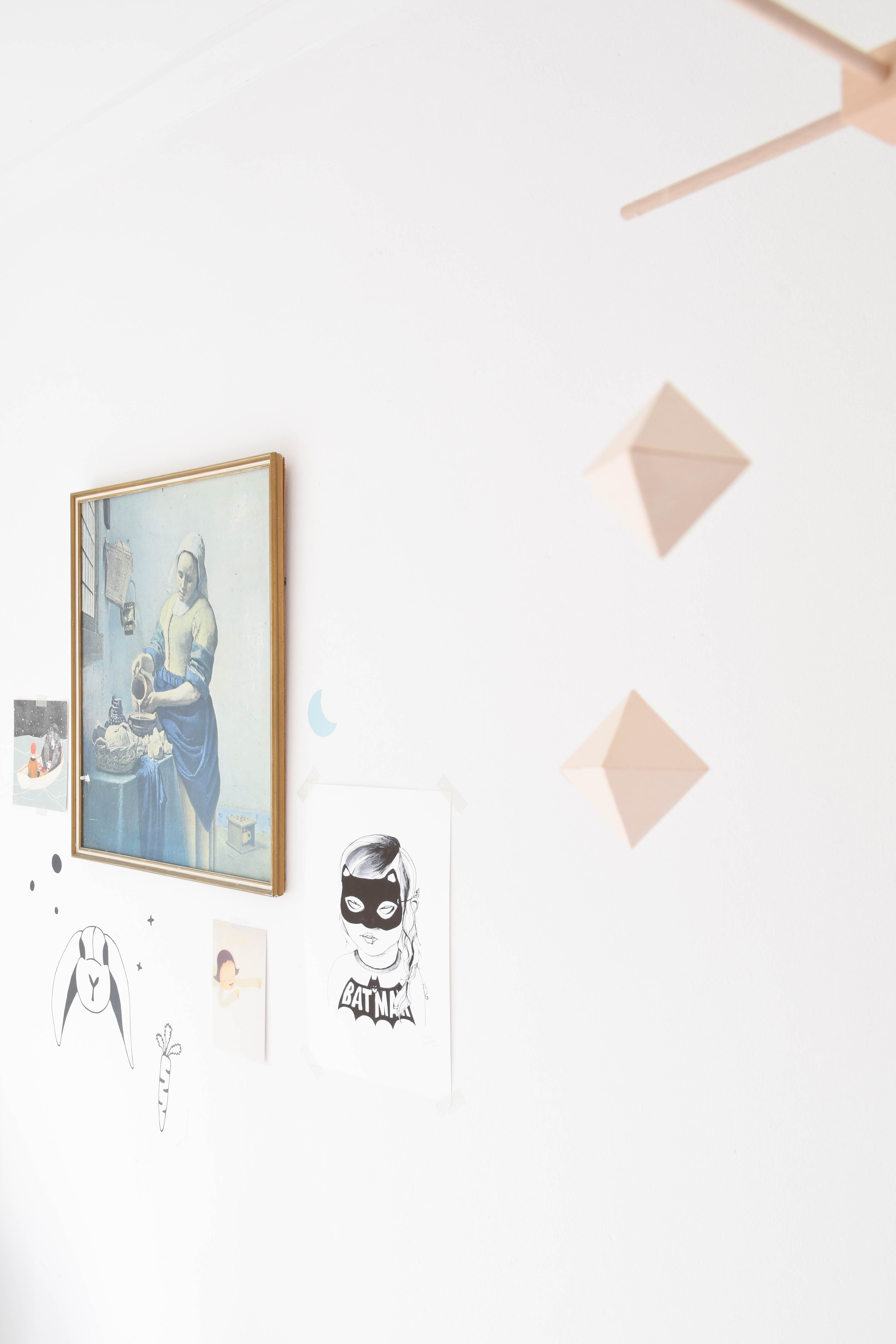 De Batgirlkaart en mobile-houder zijn vondsten van Etsy. Aan de mobile maakte Mathilde zelf mooie hangers van karton.