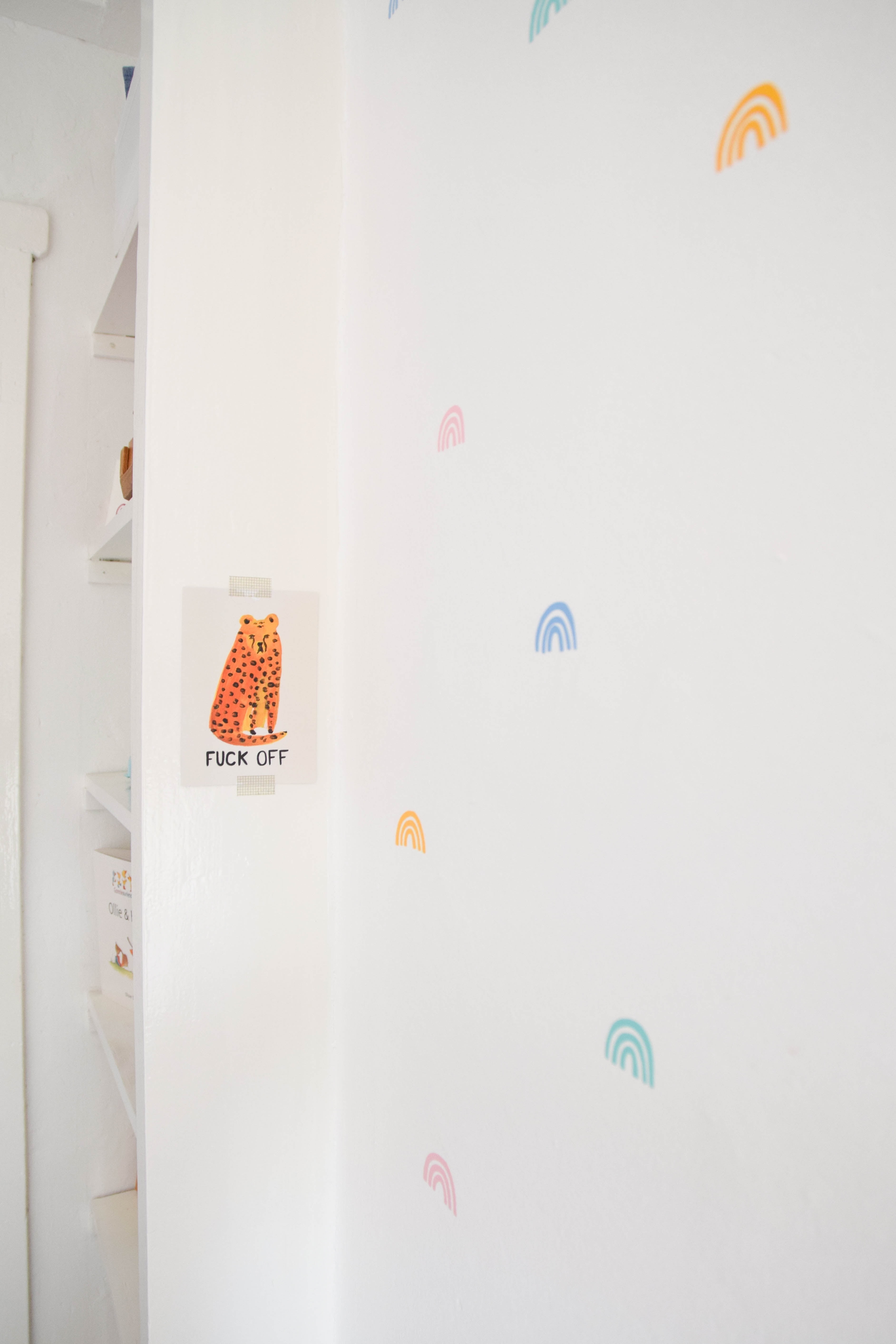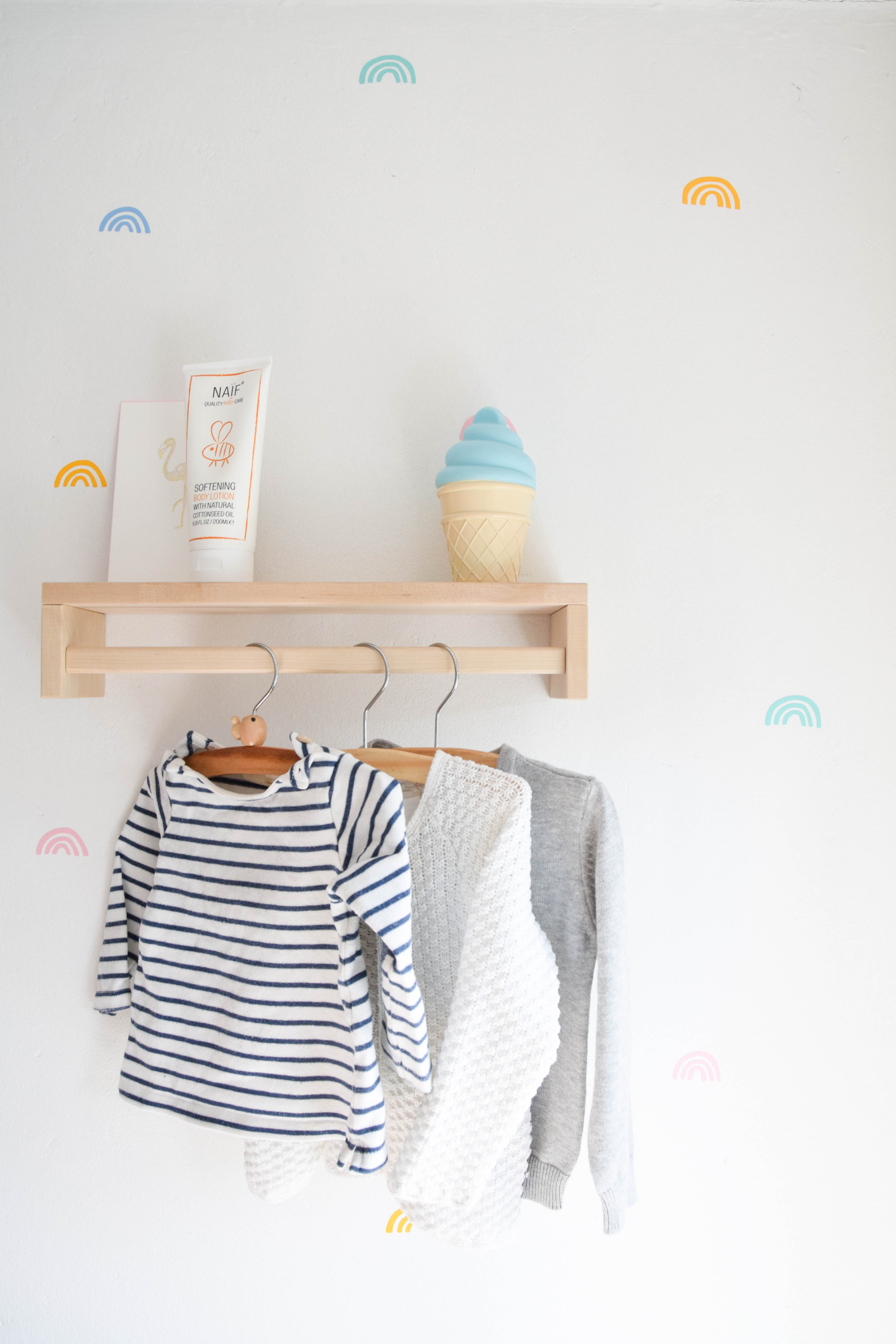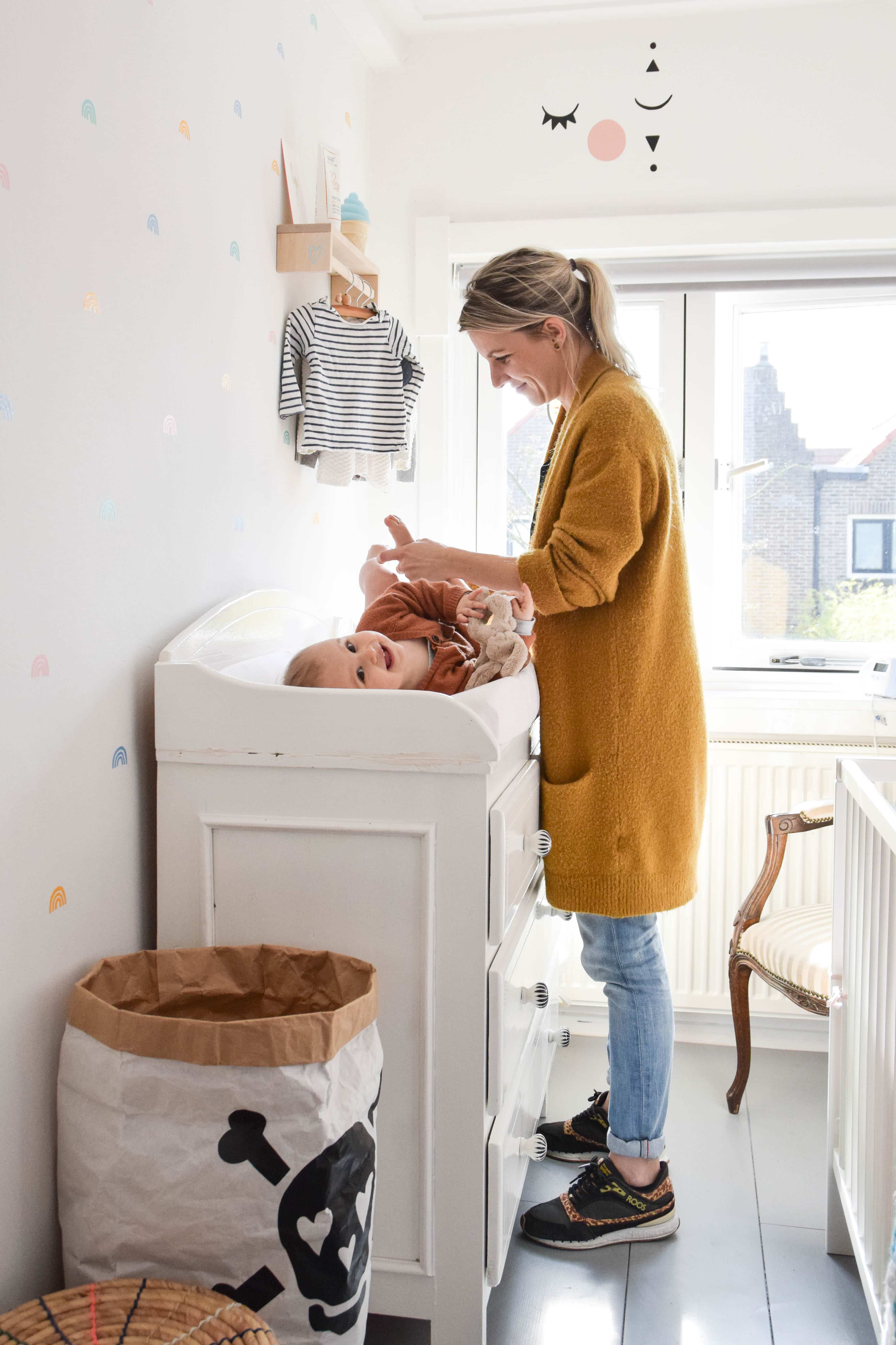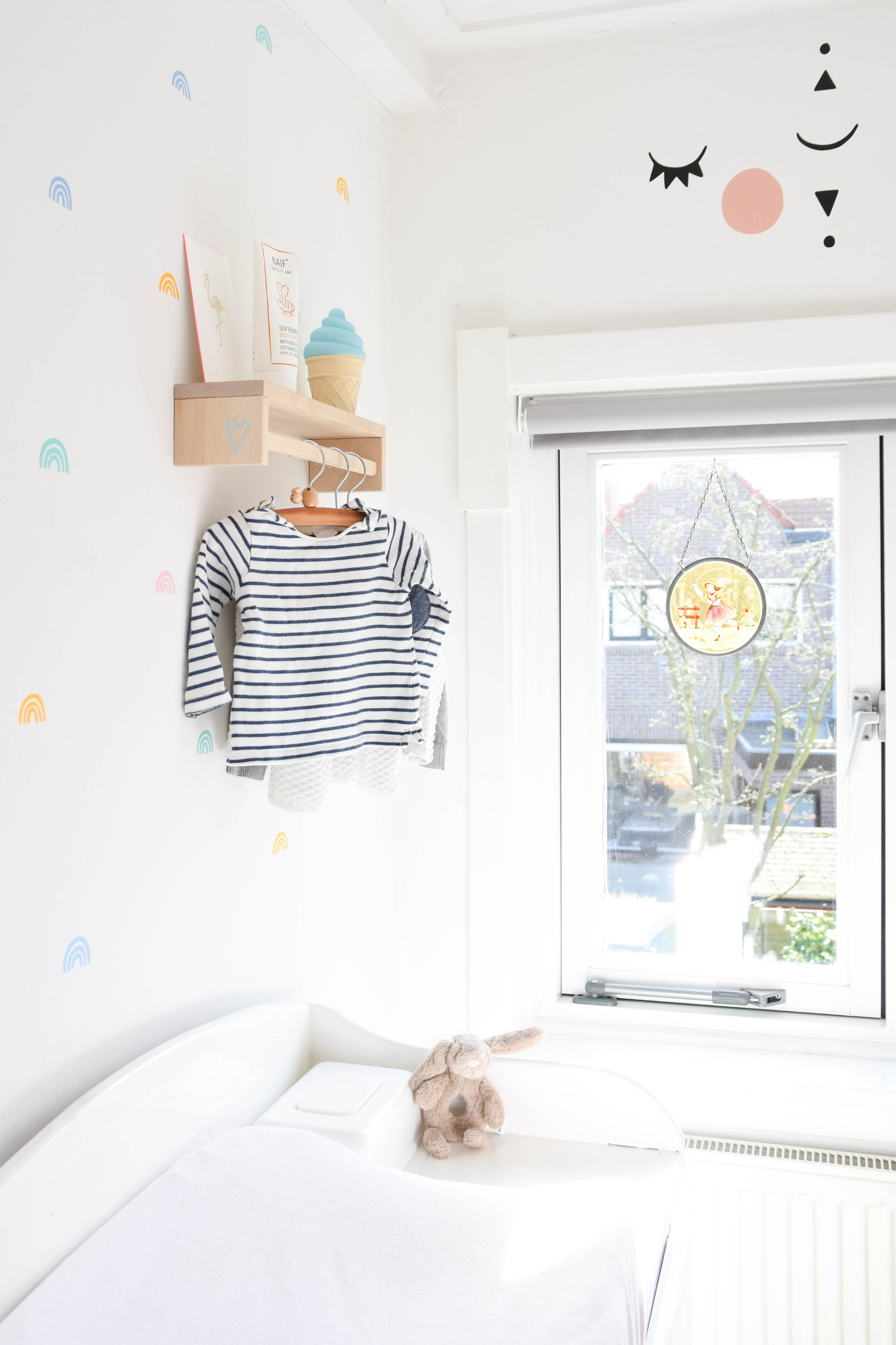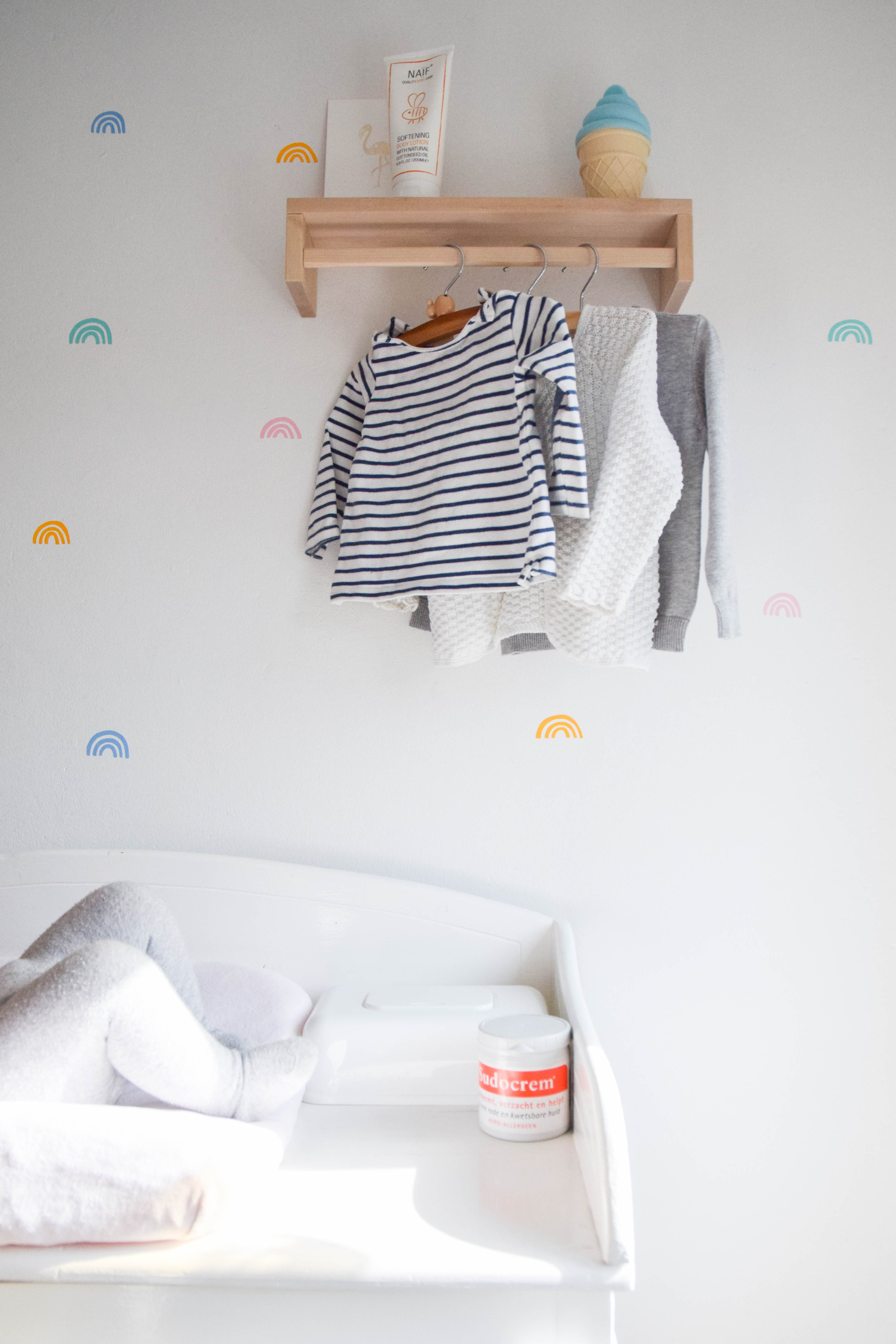 Op de muur naast de commode zie je de vrolijke regenboogstickers.
