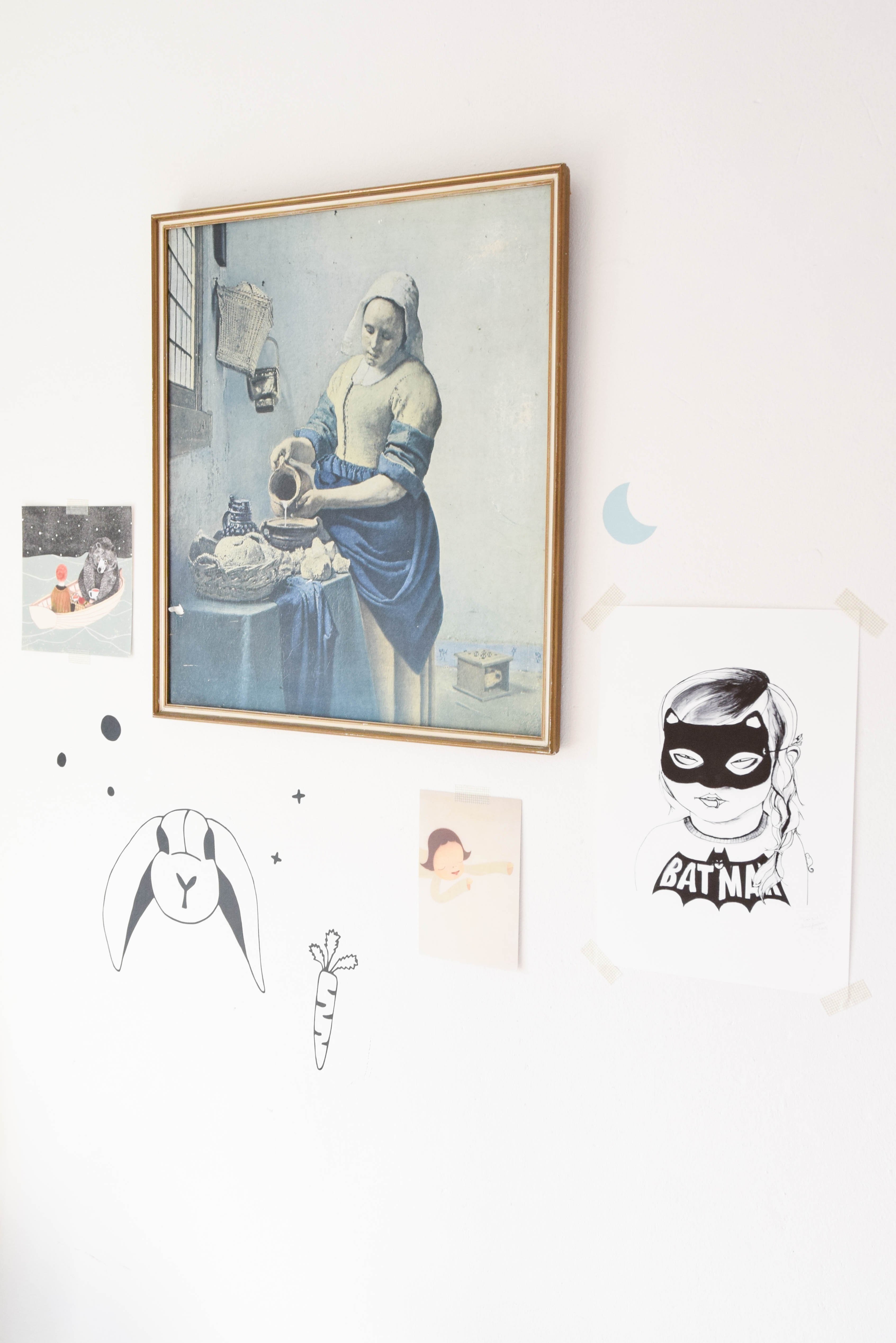 Alhoewel het schilderij van het Melkmeisje perfect in de stijl van het kamertje lijkt te passen, was het niet gekocht met de intentie om het ooit op een kinderkamer te hangen. Toen Mathilde bezig was met het inrichten van de babykamer, kwam ze deze oude kringloopvondst per toeval weer tegen op zolder en ze vond het wel een toepasselijke toevoeging aan de babykamer.