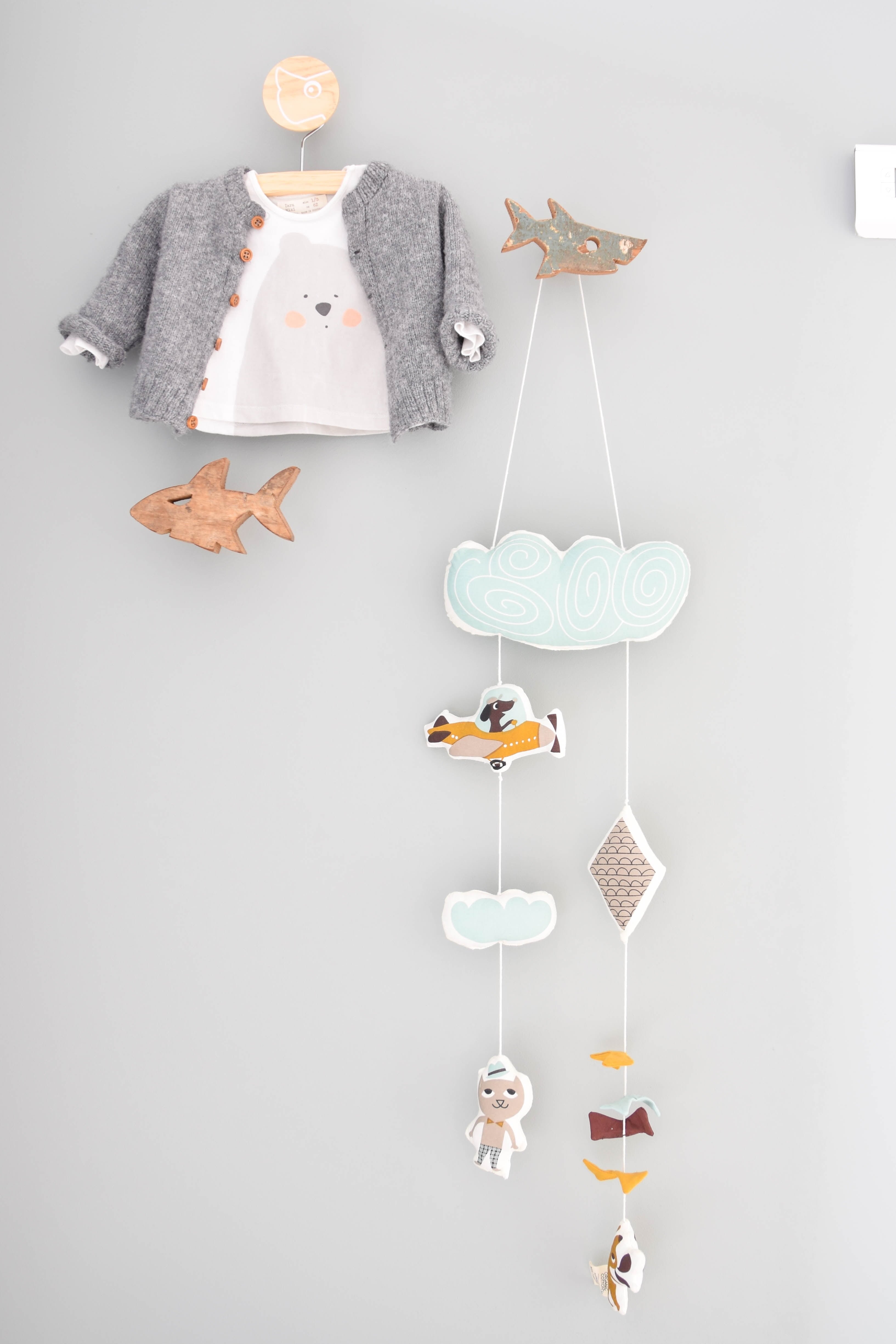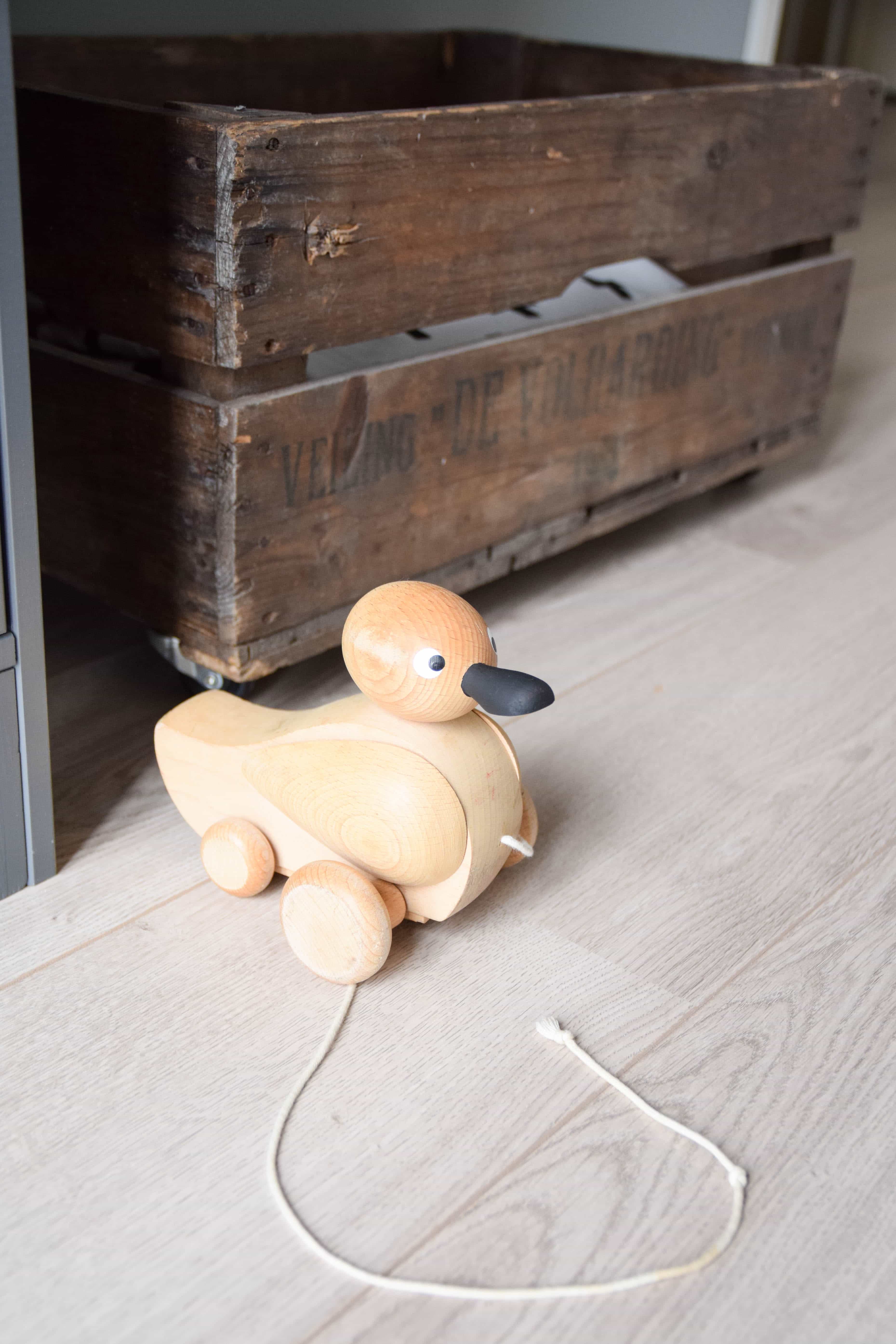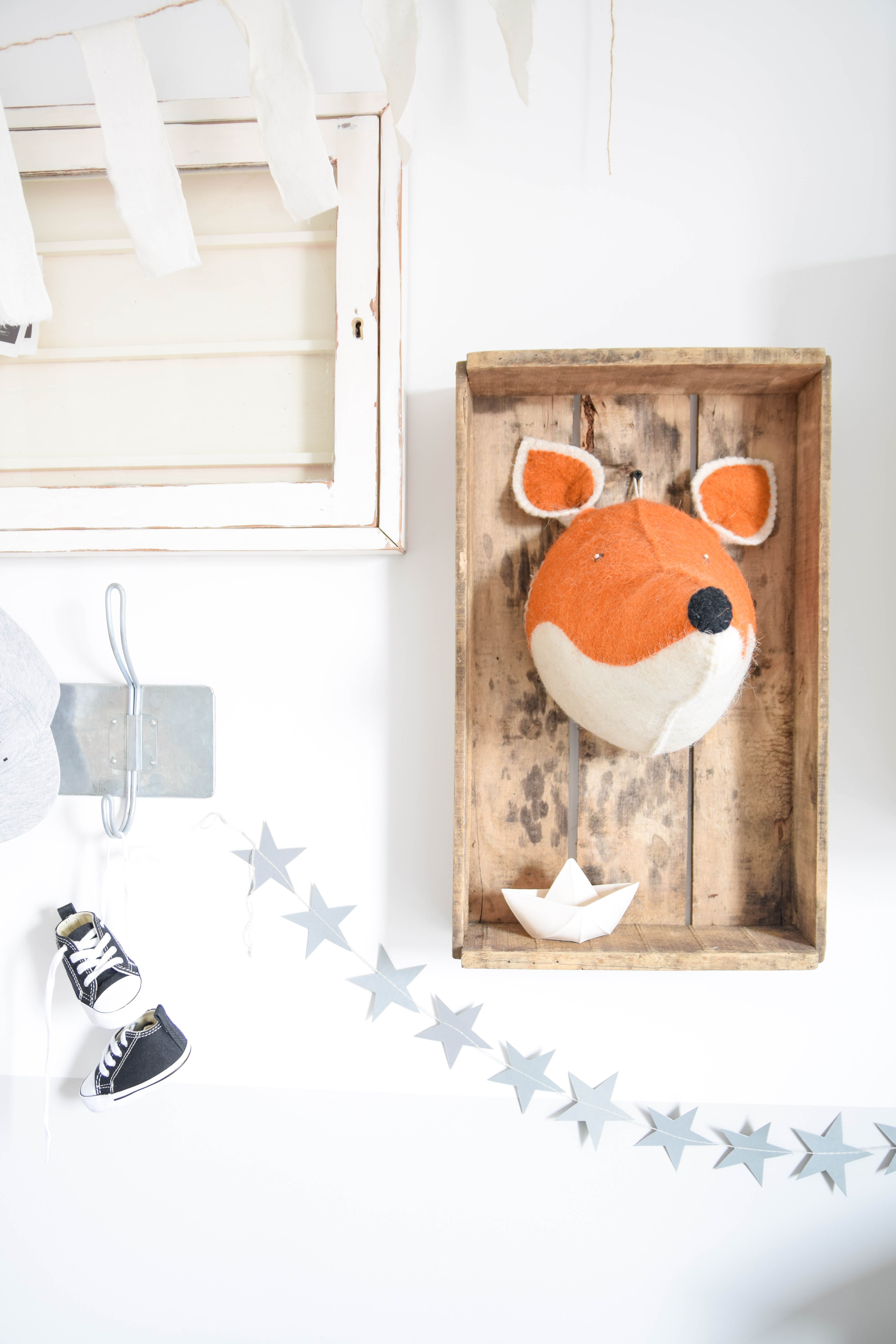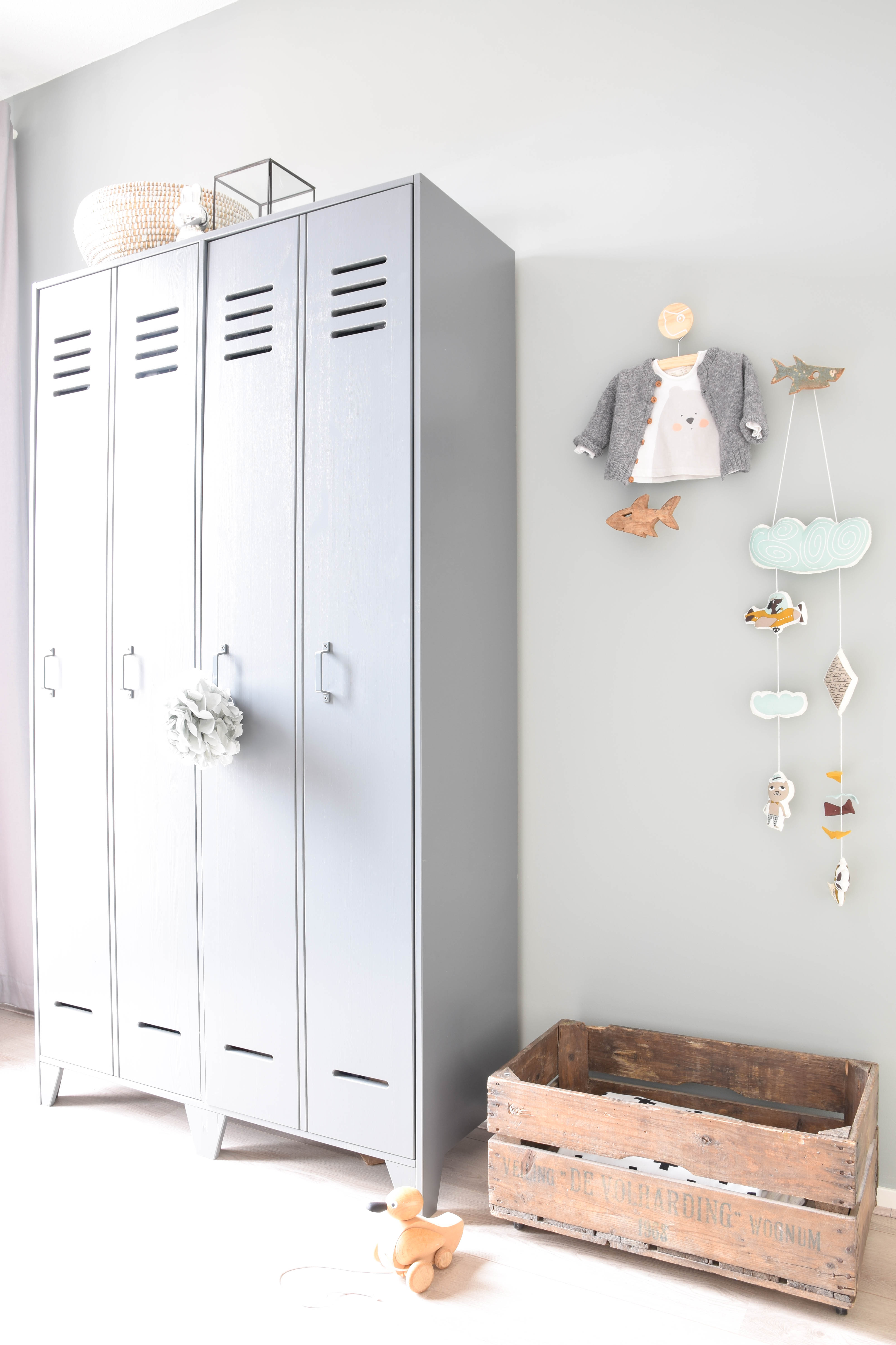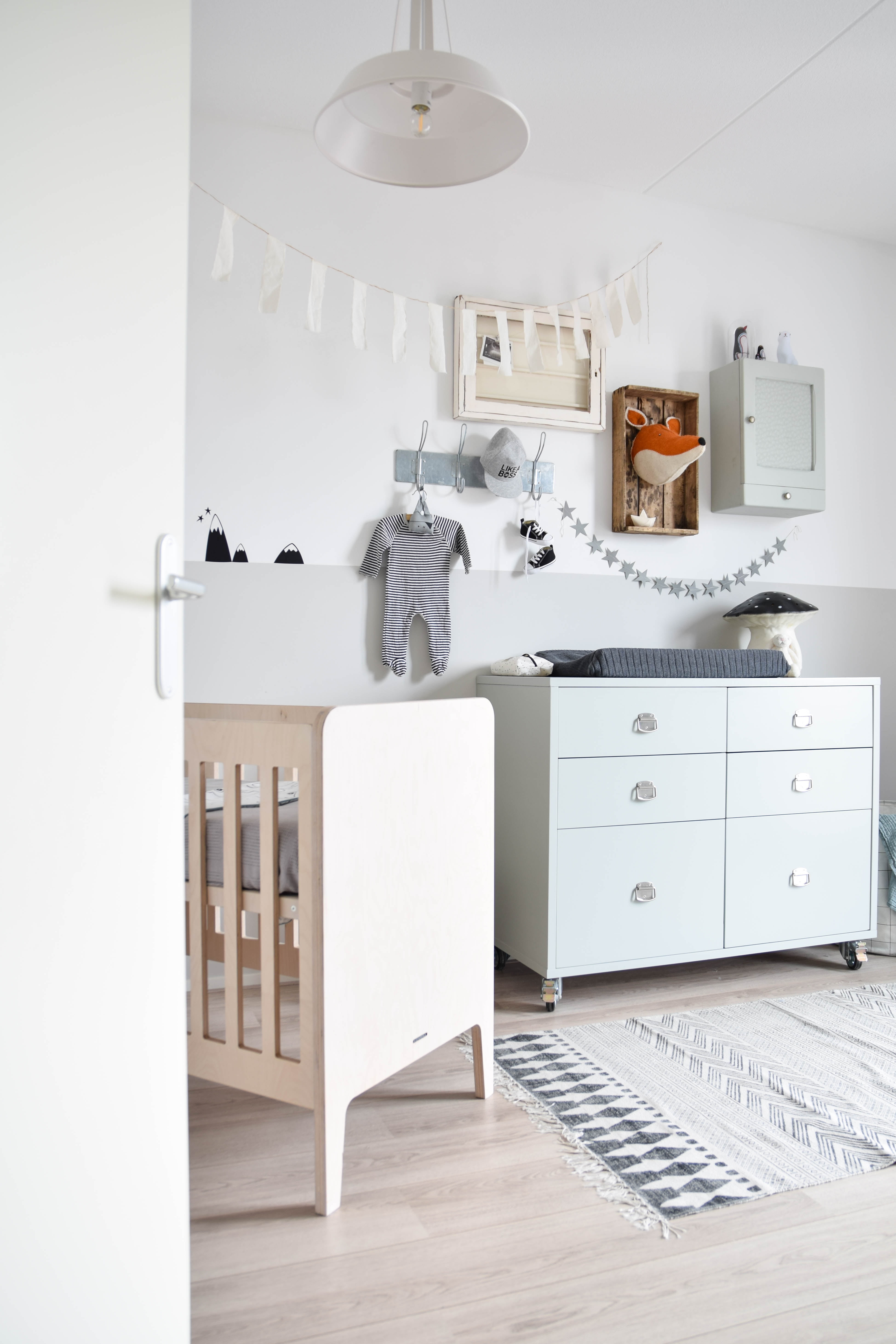 Wat ik zo mooi vind aan deze babykamer is dat je overal dezelfde materialen en kleuren terugvindt. Zelfs tot in de kleinste details! De wandhaakjes van sloophout (verkrijgbaar bij De Evenaar) in de vorm van haaien passen bijvoorbeeld perfect bij het houten kratje op wieltjes eronder.