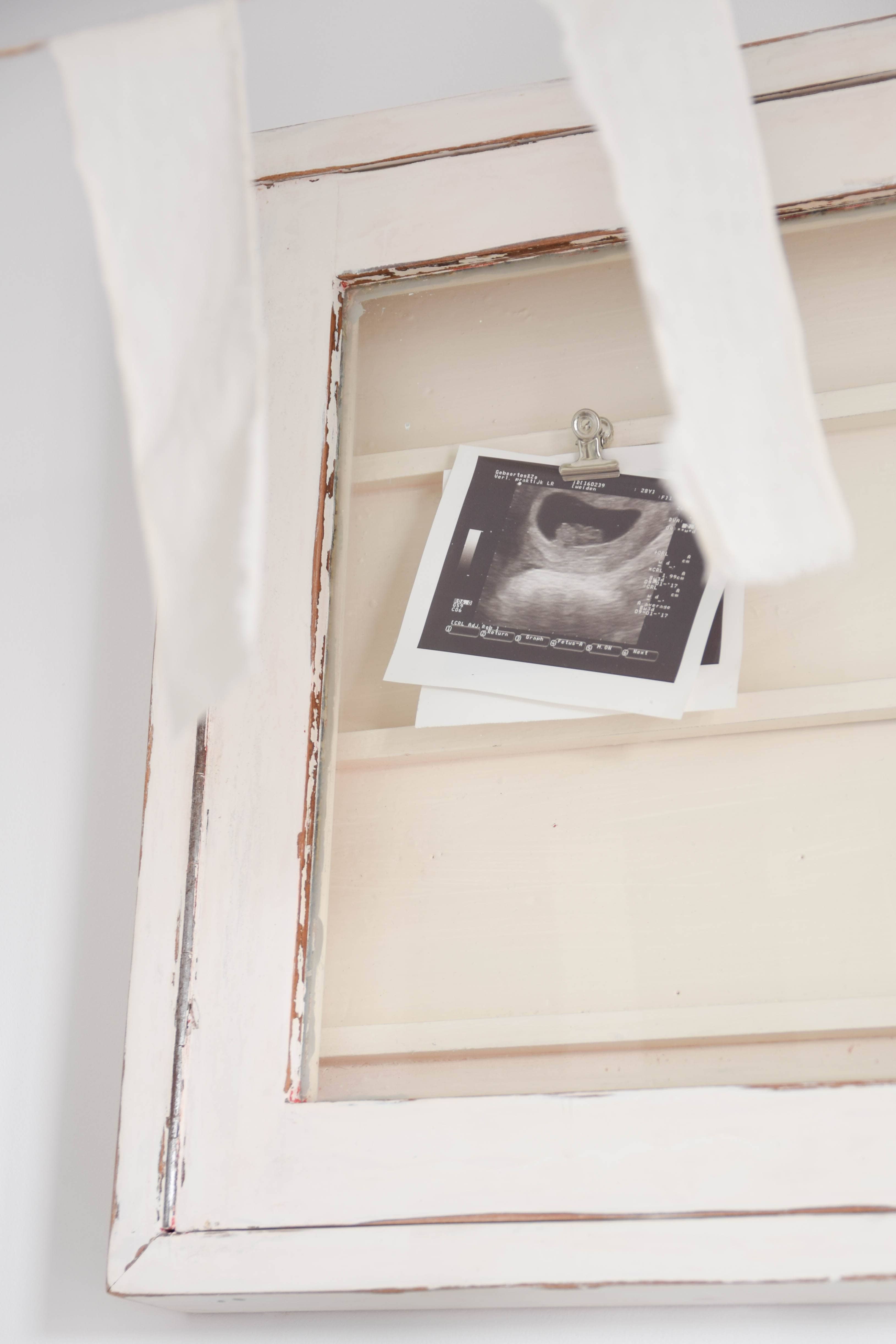 Boven de commode heeft Elina een prachtige verzameling kastjes gehangen. Allemaal tweedehands en zelf opgeknapt. Het linkerkastje was een sieradenkistje dat Elina vond op een rommelmarkt. De buitenkant was rood geverfd en het heeft Elina behoorlijk wat moeite gekost om al die verf eraf te krijgen. Nu hangt hij mooi aan de muur te pronken met een echofoto van Fedde erin.