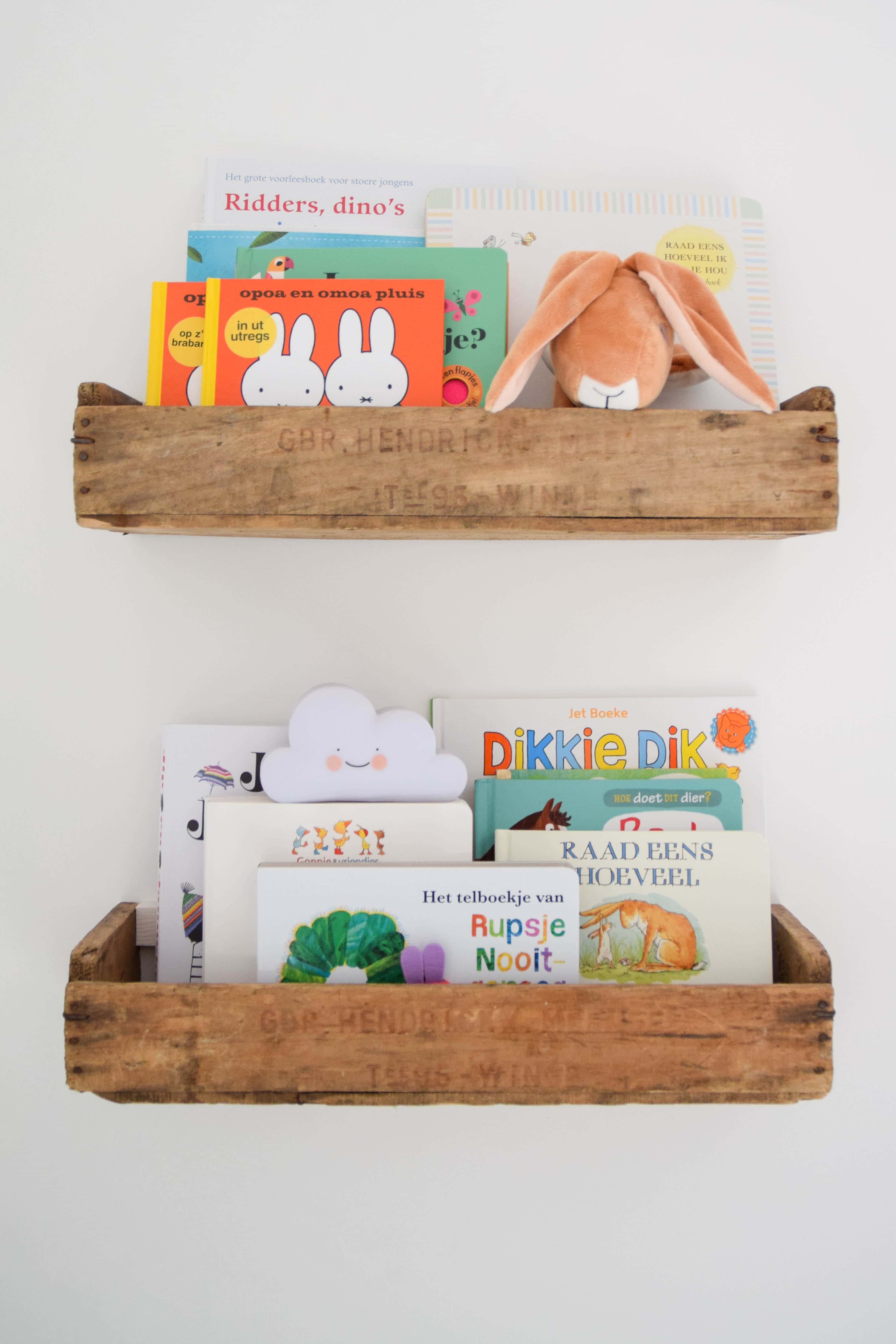 In de andere hoek van de slaapkamer vind je weer zo’n leuk diy projectje van Elina. Op twee boekenplanken – die ze maakte uit resthout – verzamelt ze alvast leuke voorleesboekjes.