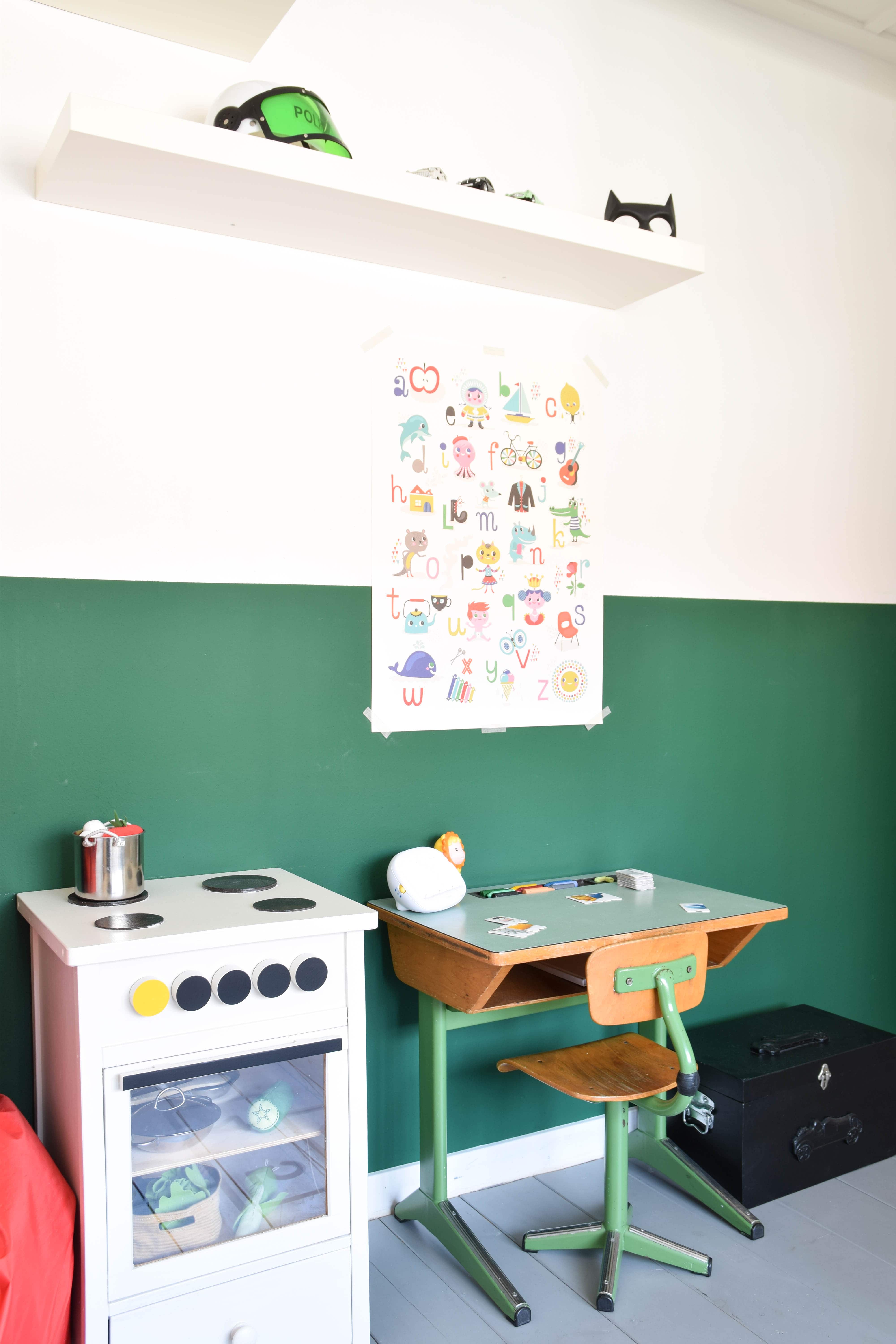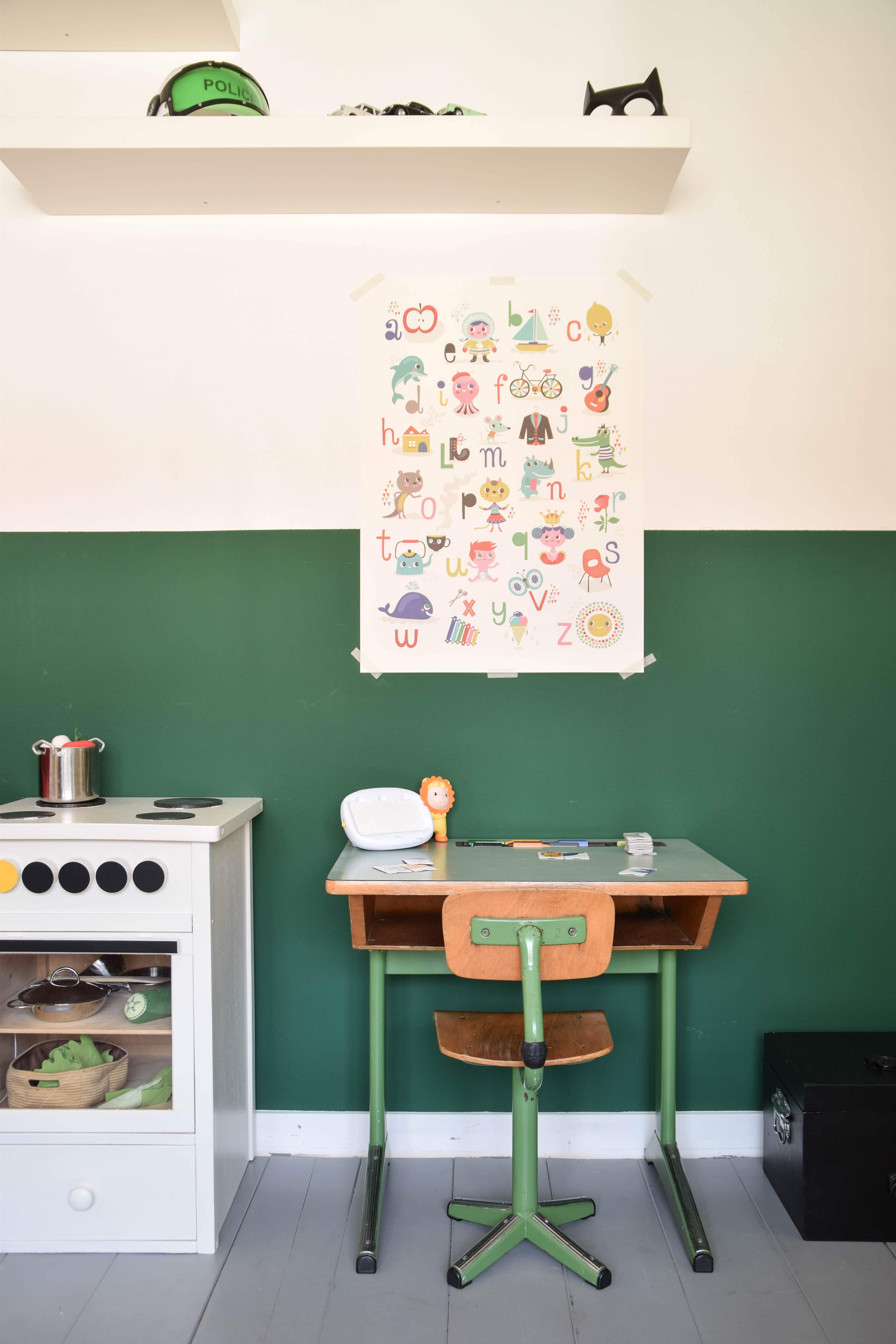 Wow! Houd jij ook zo van stoere jongenskamers? Deze kinderkamer met groene lambrisering en retro look vind ik te gek. Een fijn bureau om te knutselen, een hinkelbaan in het midden van de kleuterkamer en zelfs een eigen speelkeuken. Deze slaapkamer van de 4-jarige Tobe heeft het allemaal.