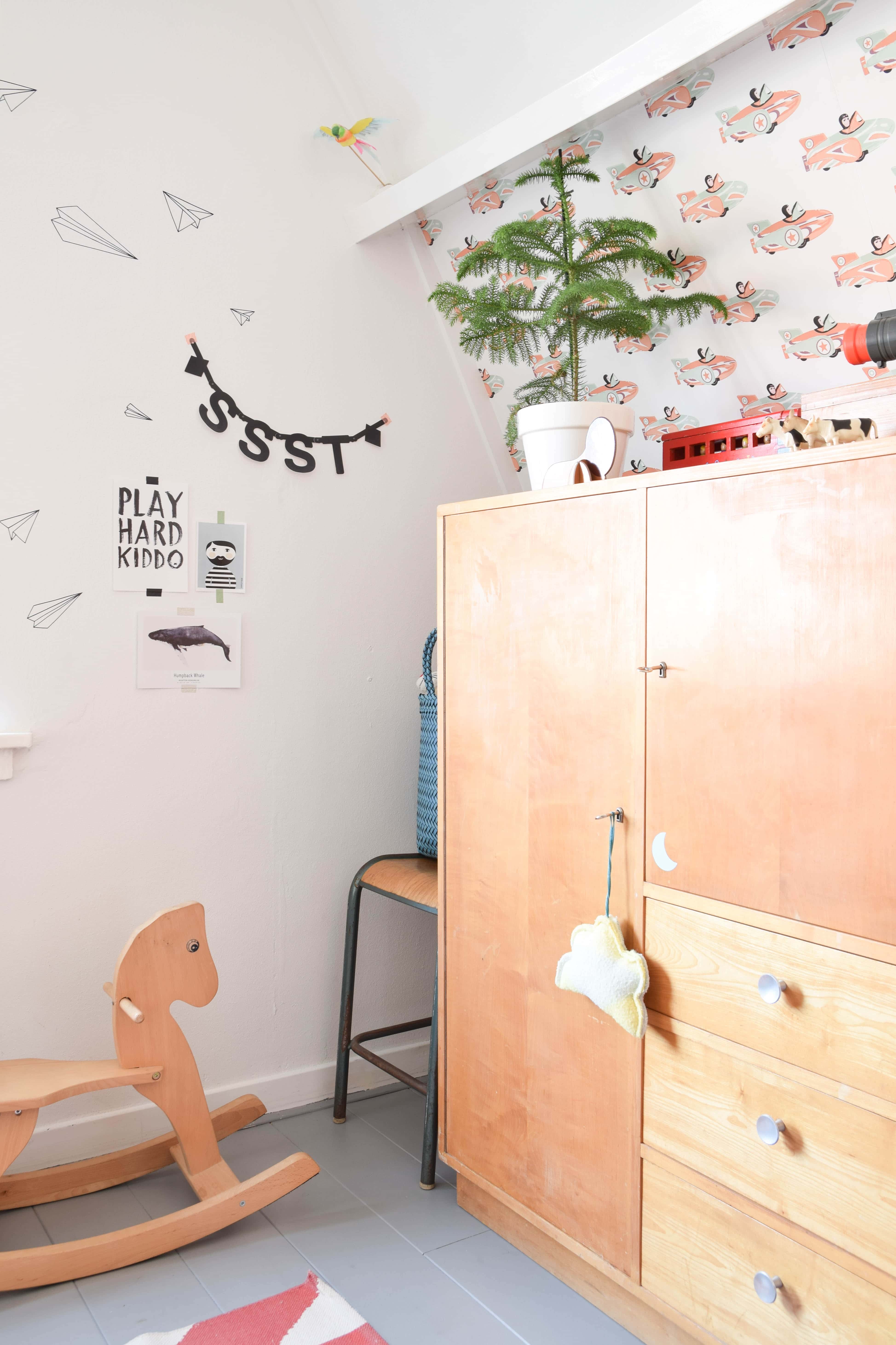 Het toffe behang (Studio Ditte) is een echte eye-catcher in deze kinderkamer. Toch is Mathilde druk op zoek naar iets nieuws, want ze is er zelf wel een beetje op uitgekeken.