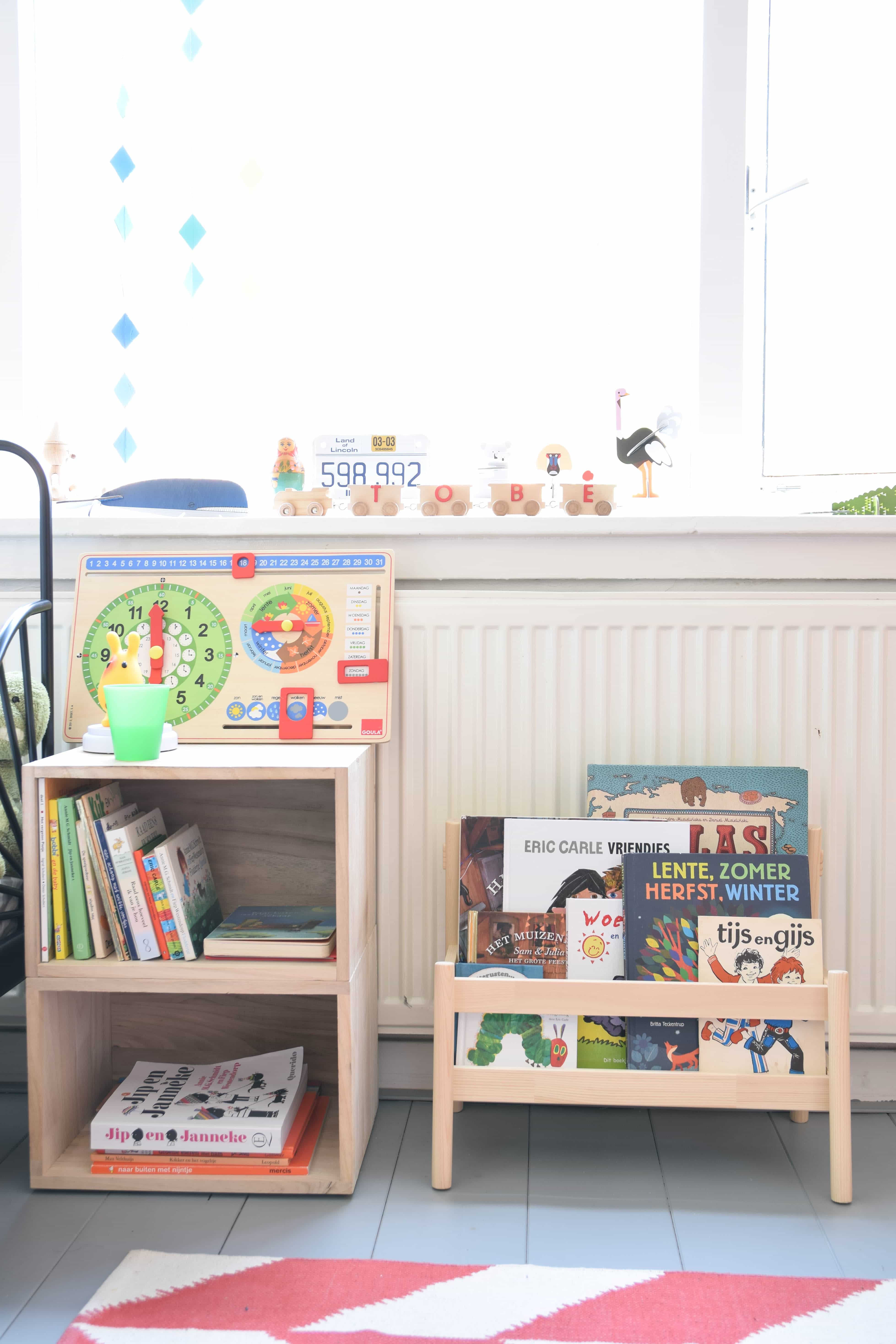 De boekjes staan expres binnen handbereik zodat Tobe ze zelf kan pakken om te “lezen”.