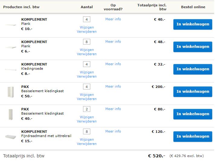 In totaal heeft deze PAX inloopkast ons €535,- gekost. €520,- voor de kast zelf en €15,- voor de service van IKEA waarbij de hele bestelling voor je klaar staat bij het ophalen. Ik grapte tegen vriendlief dat we dat geld ook zeker kwijt waren geweest als we de kasten hadden moeten ophalen en ik tijdens het winkelen de winkelwagen had volgegooid met andere spullen die we toch niet echt nodig hebben.