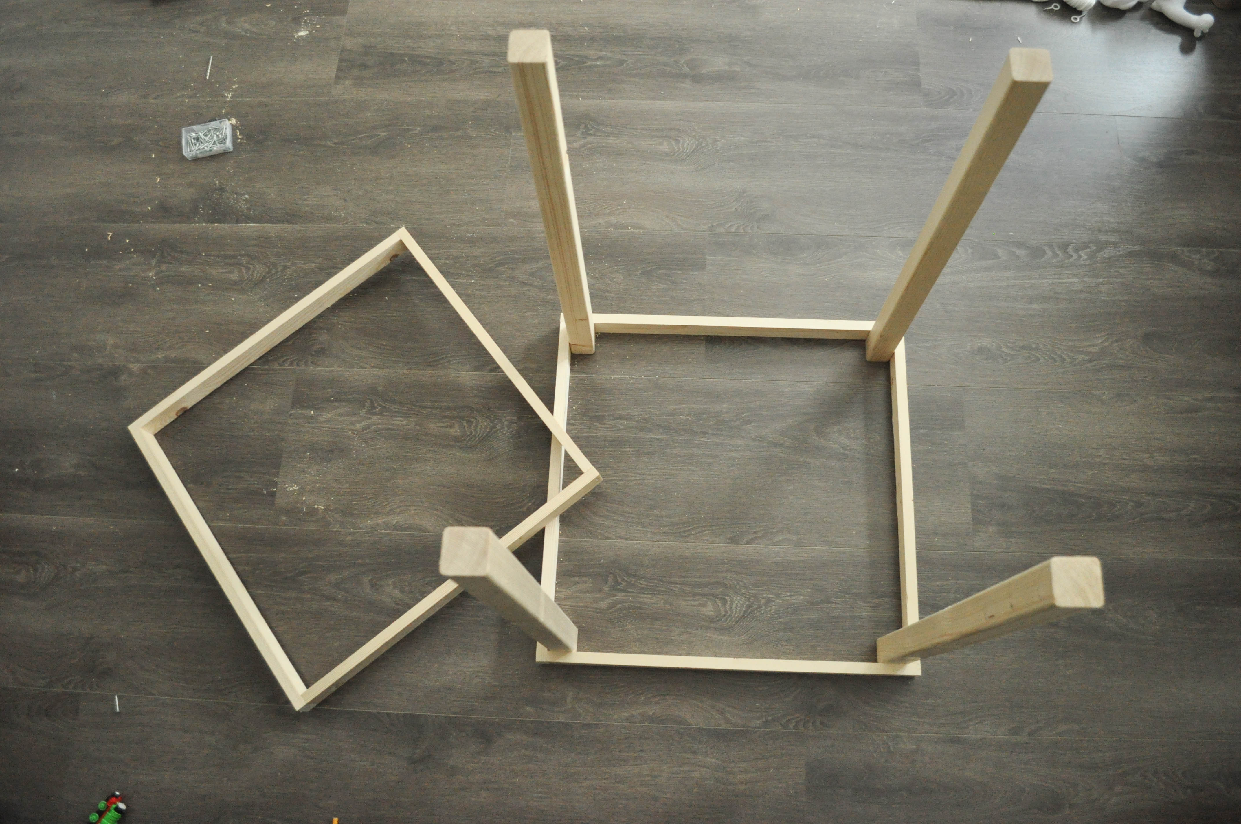 Herhaal deze stap zodat je 2 keer een vierkant hebt. Dan gaan we de hoogte in. Gebruik hiervoor de 4 houten balken van 80 cm. Zet de balken in de hoeken van een van de vierkanten – ook hier weer eerst voorboren, daarna verzinken en vastschroeven. Herhaal dit bij alle balken.