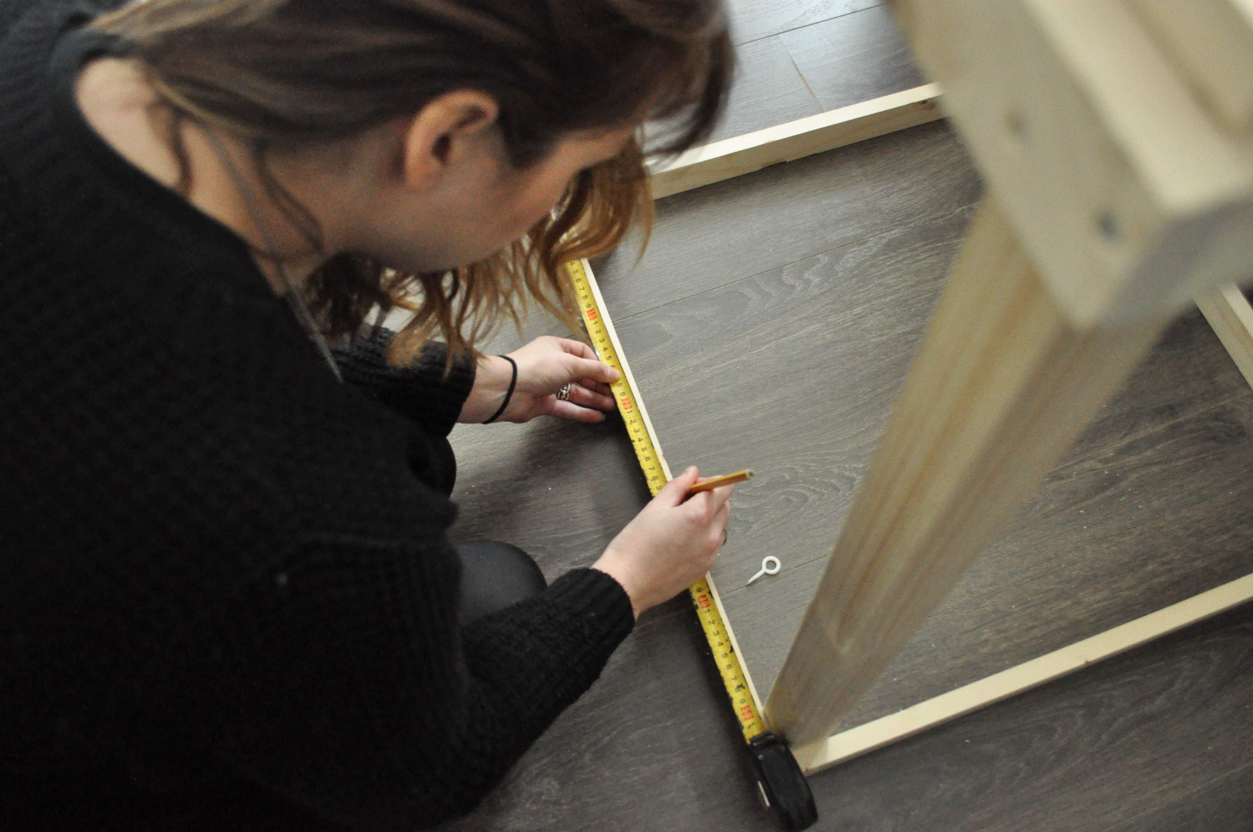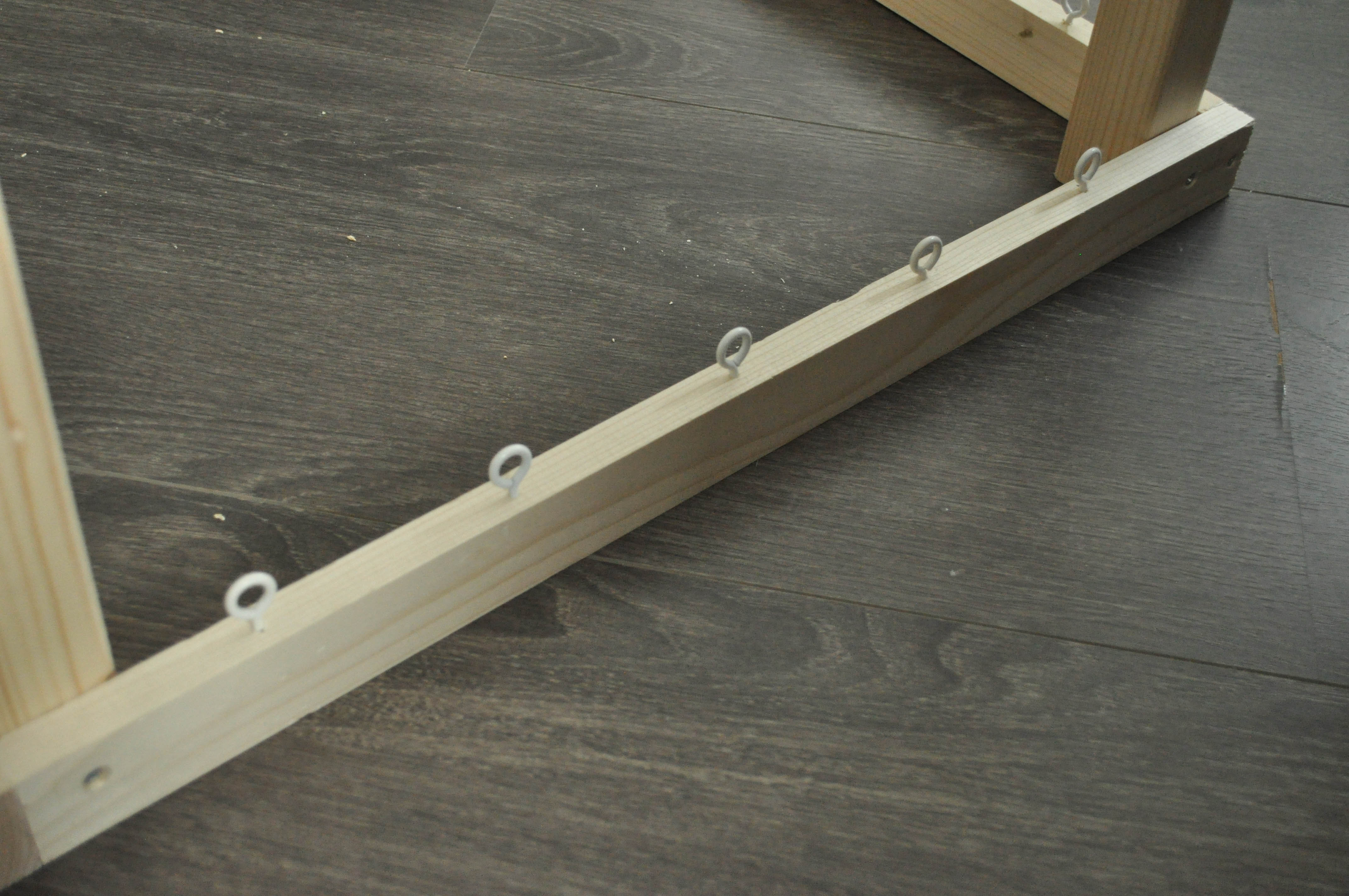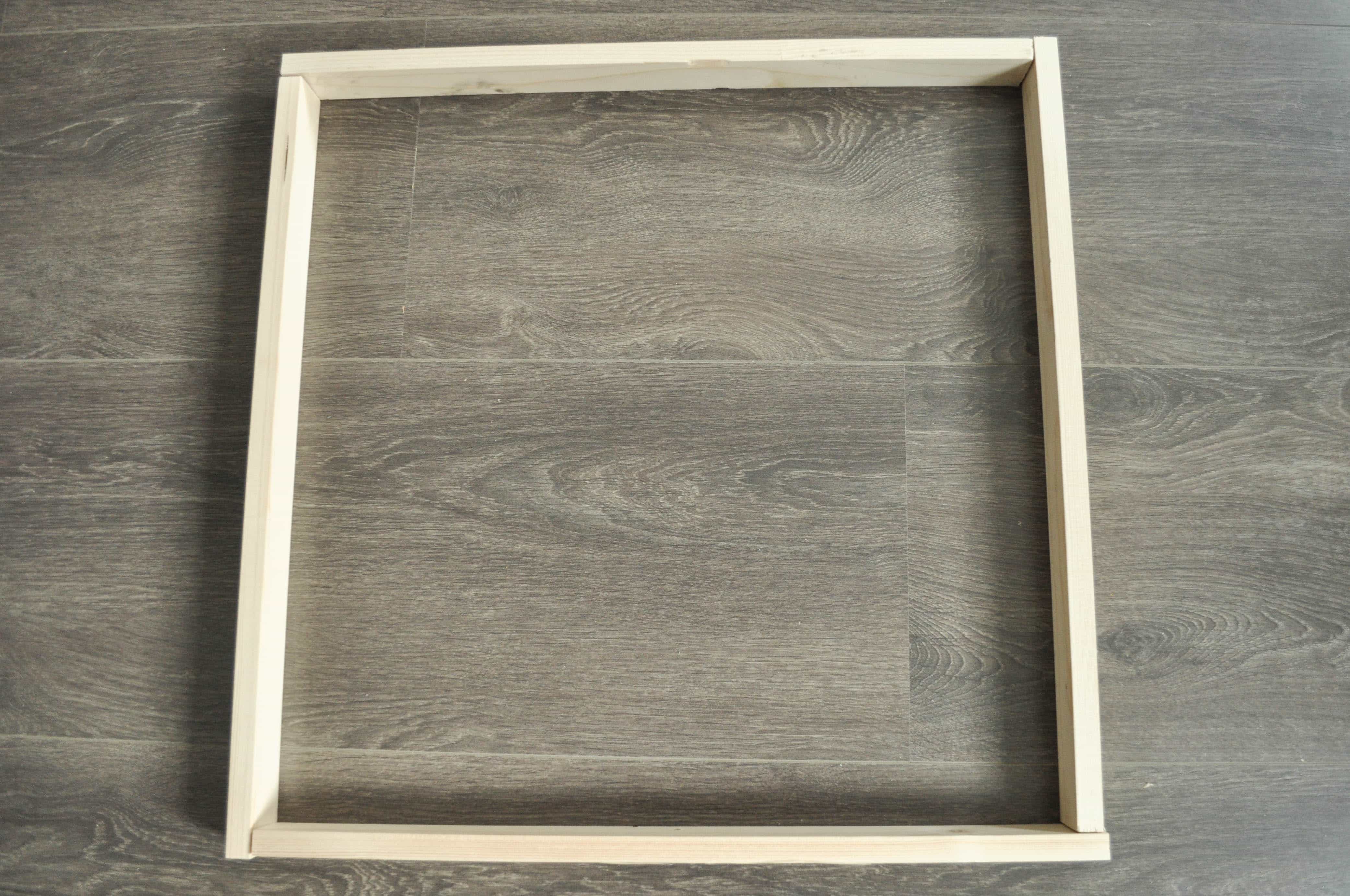 Begin met het maken van een basis-vierkant voor de knuffelopberger. Gebruik hiervoor de 60 cm lange latten. Wij hebben gekozen voor een ‘koude verbinding’ van de latten. Uiteraard kun je ook kiezen om dit op een andere manier met elkaar te verbinden, maar houd er dan wel rekening mee dat het een vierkant blijft.
