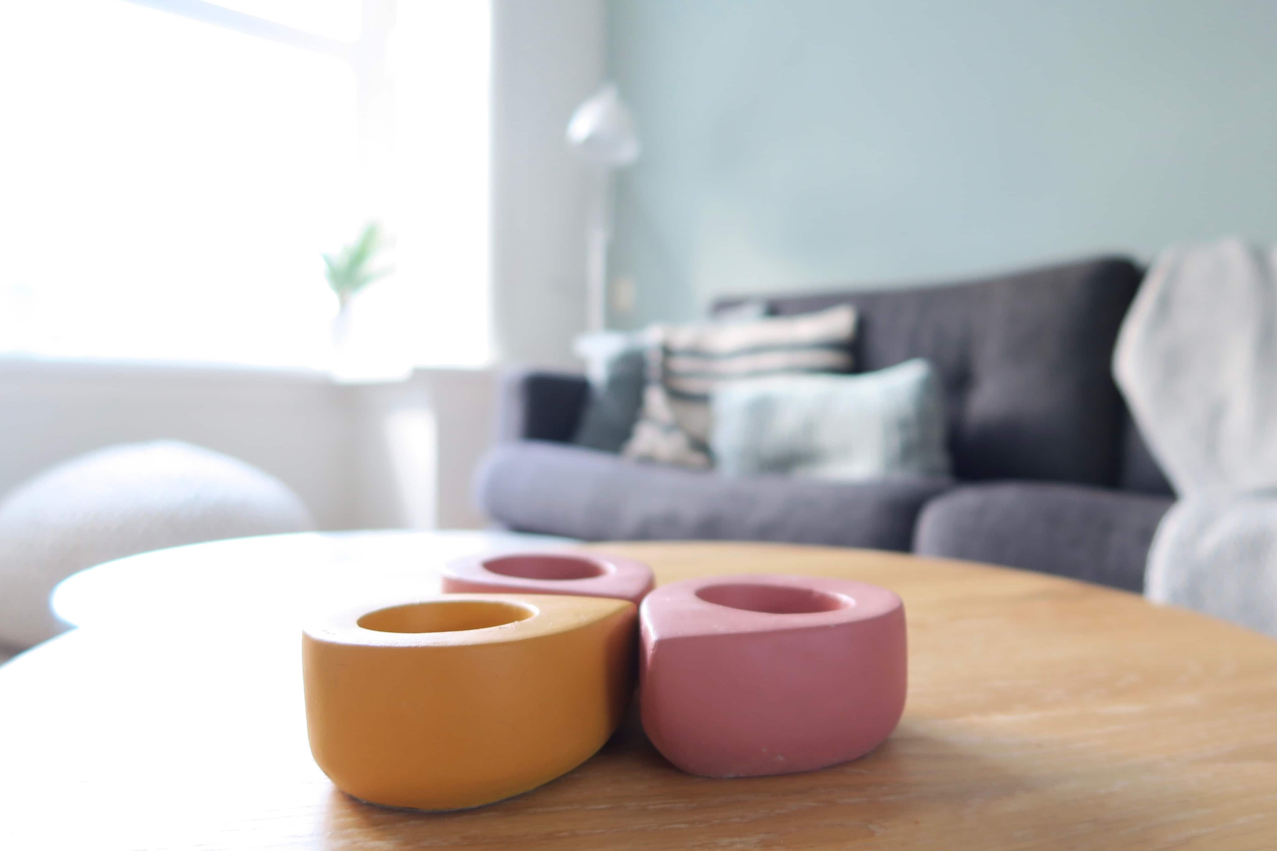 In dit mooie hoekje vind je ook twee tafeltjes van Zuiver en Butik Living. De mooie kussens op de bank en de poef op de grond komen bij Loods 5 vandaan. Maar Hedwig shopt niet alleen designspul hoor. Ze houdt ook van low-budget koopjes. Zoals deze kleurige waxinelichthouders van Zeeman.