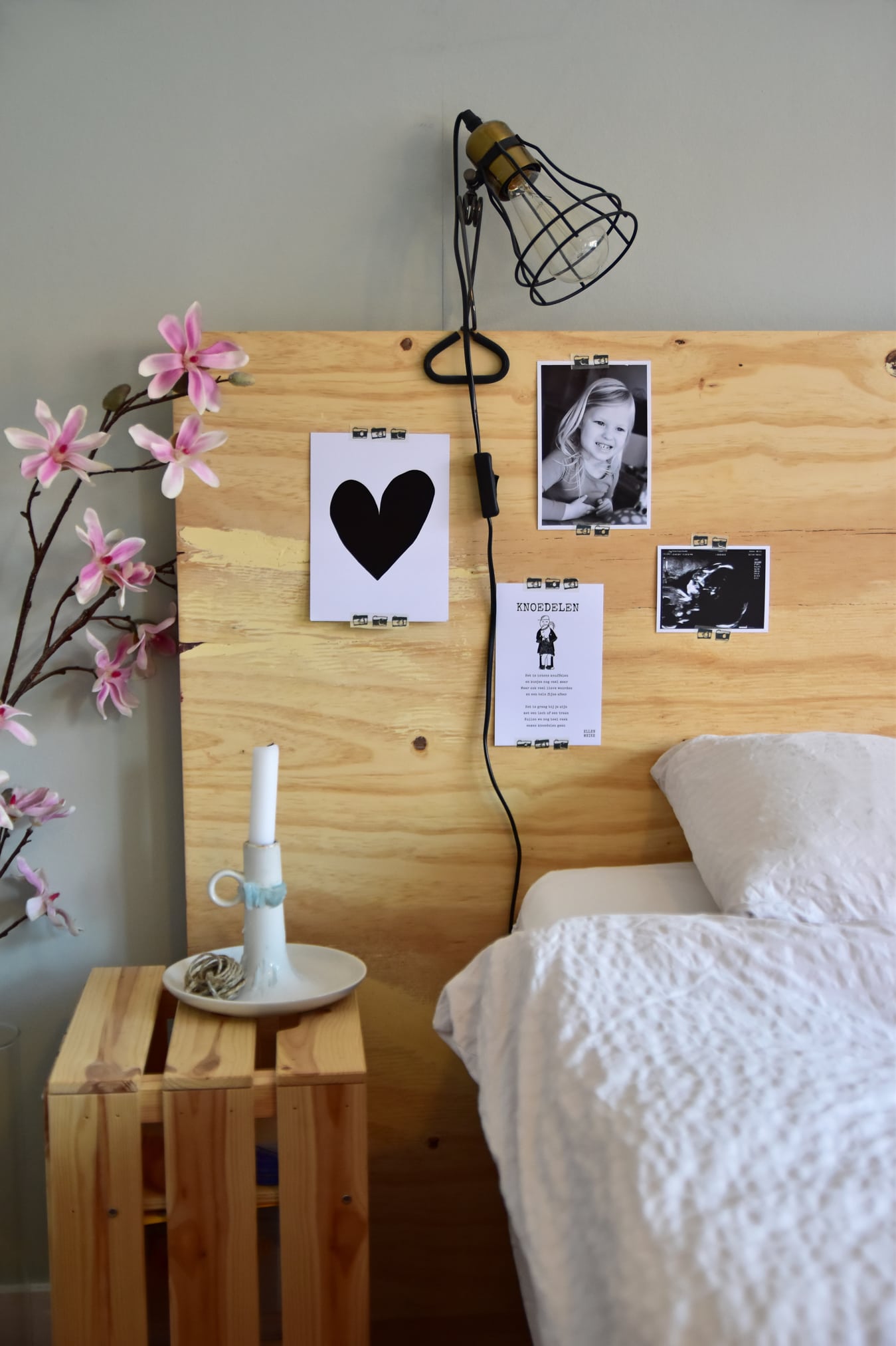In de slaapkamer zijn een aantal DIY’s van Ilse te vinden. Van underlayment maakte ze bijvoorbeeld een hoofdbord voor het bed en Ikea kistjes toverde ze om tot nachtkastjes, door er een plank in te maken. Dat is nog eens een toffe Ikea hack!
