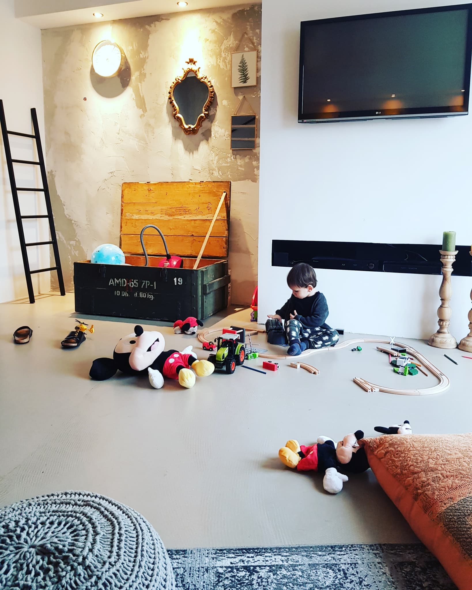 Overdag is het hier een gezellige chaos. Uit de speelgoedkist komen Riley’s favoriete speeltjes tevoorschijn. Als Melissa vrij is vindt ze het heerlijk om op de bank te ploffen, die tegenover de speelgoedkist staat. Hiervandaan kan ze naar Riley kijken en gezellig met hem kletsen.