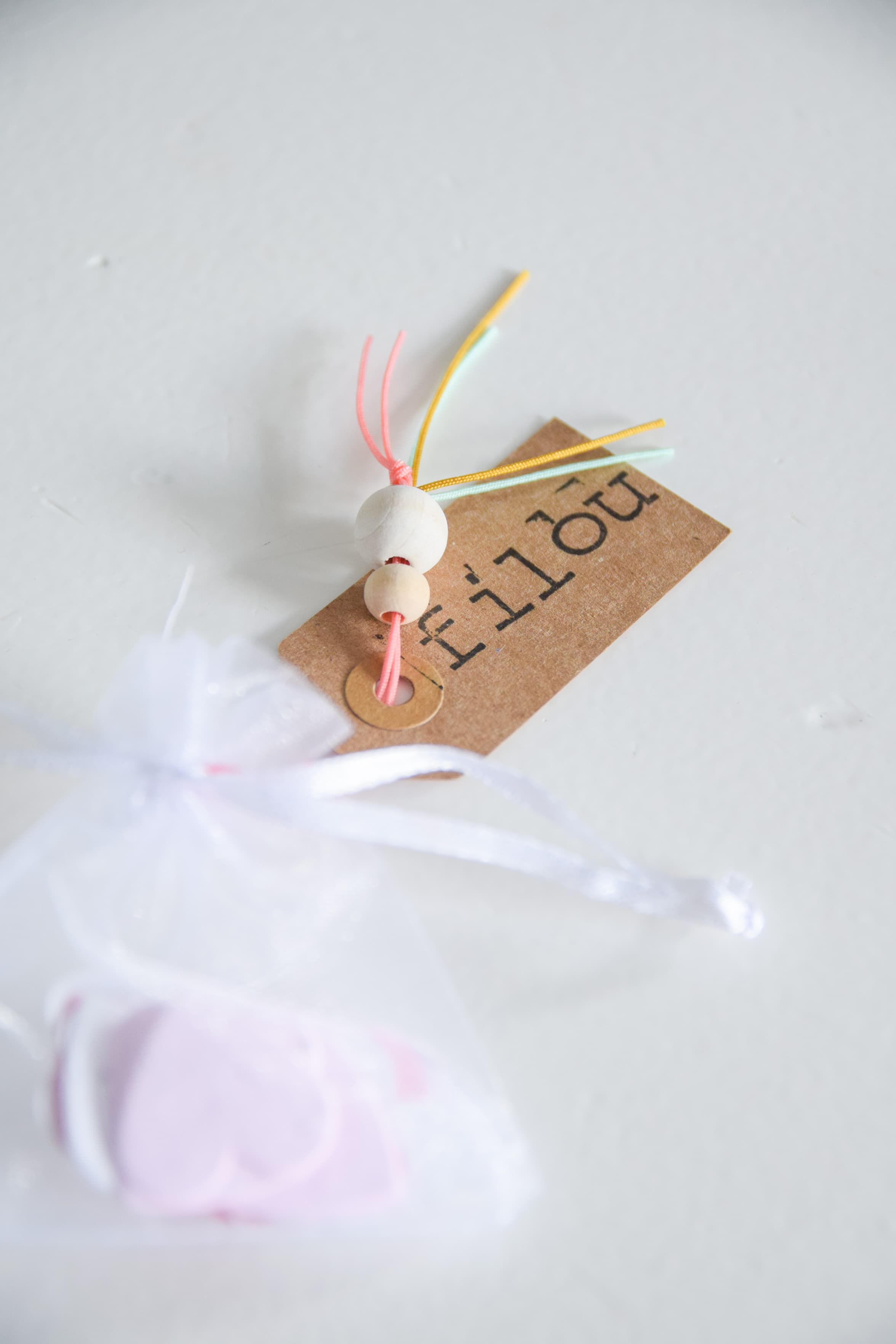 Aan de zakjes hing ik cadeaulabels van de HEMA – met daarop de naam van Filou gestempeld – en een gelukspoppetje, besteld bij Gelukspoppetjes.eu.