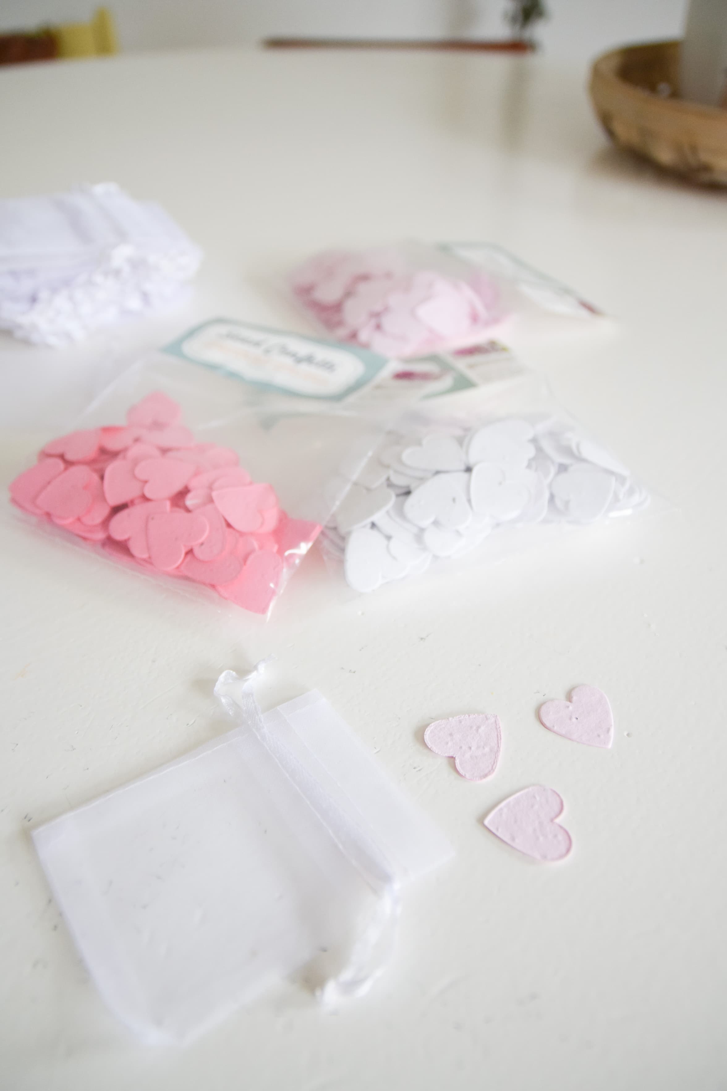 Ik koos voor de kleuren wit, lichtroze en fuchsia. Deze bloemenconfetti stopte ik in witte organza zakjes. Gelukkig wilde mijn moeder wel even helpen bij het vullen van de zakjes, want dat was nog best een klus!