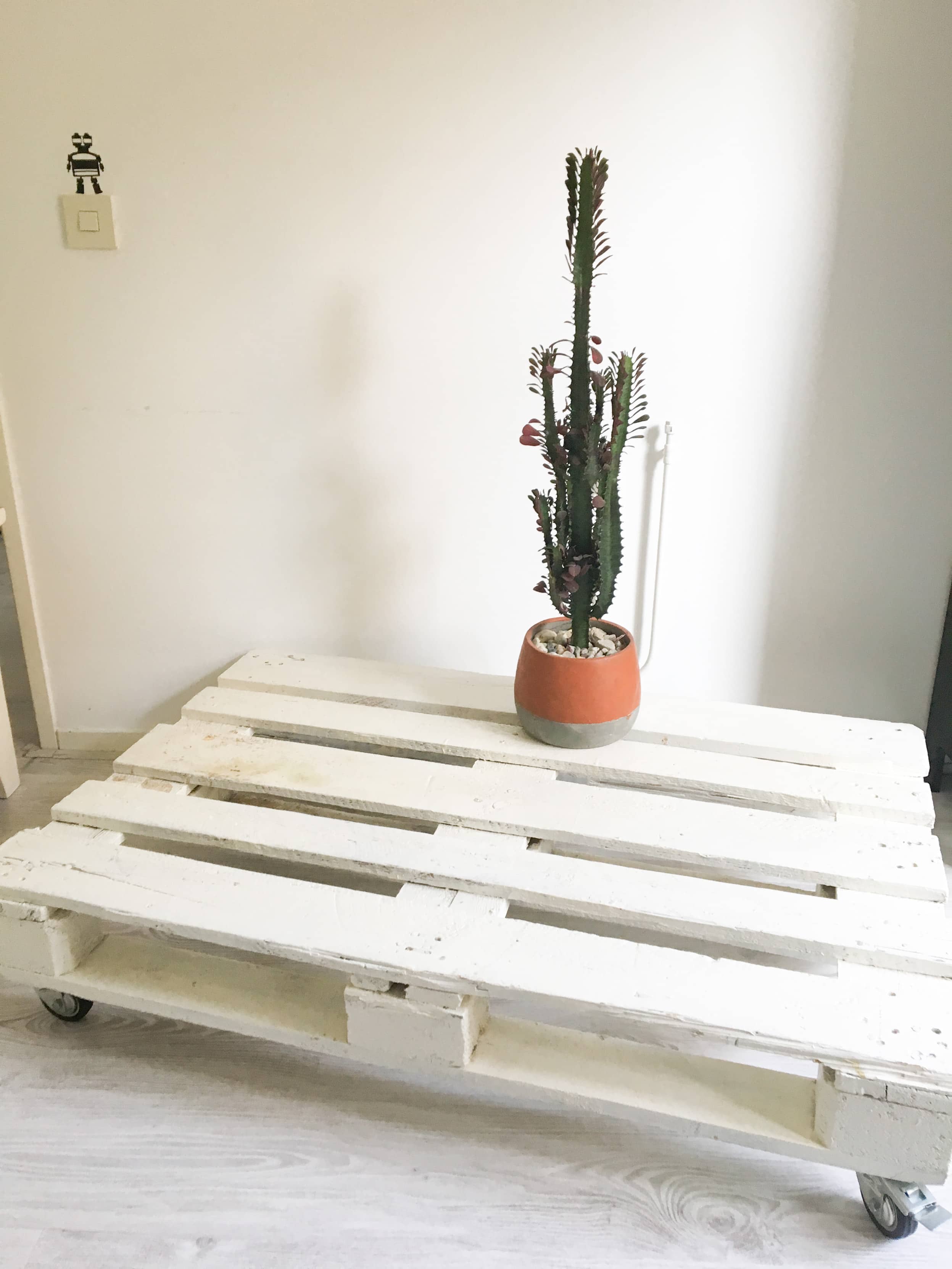 Stoere pallettafel op zwenkwieltjes (119,5x78x24). Kan wel een likje verf gebruiken! €20,-