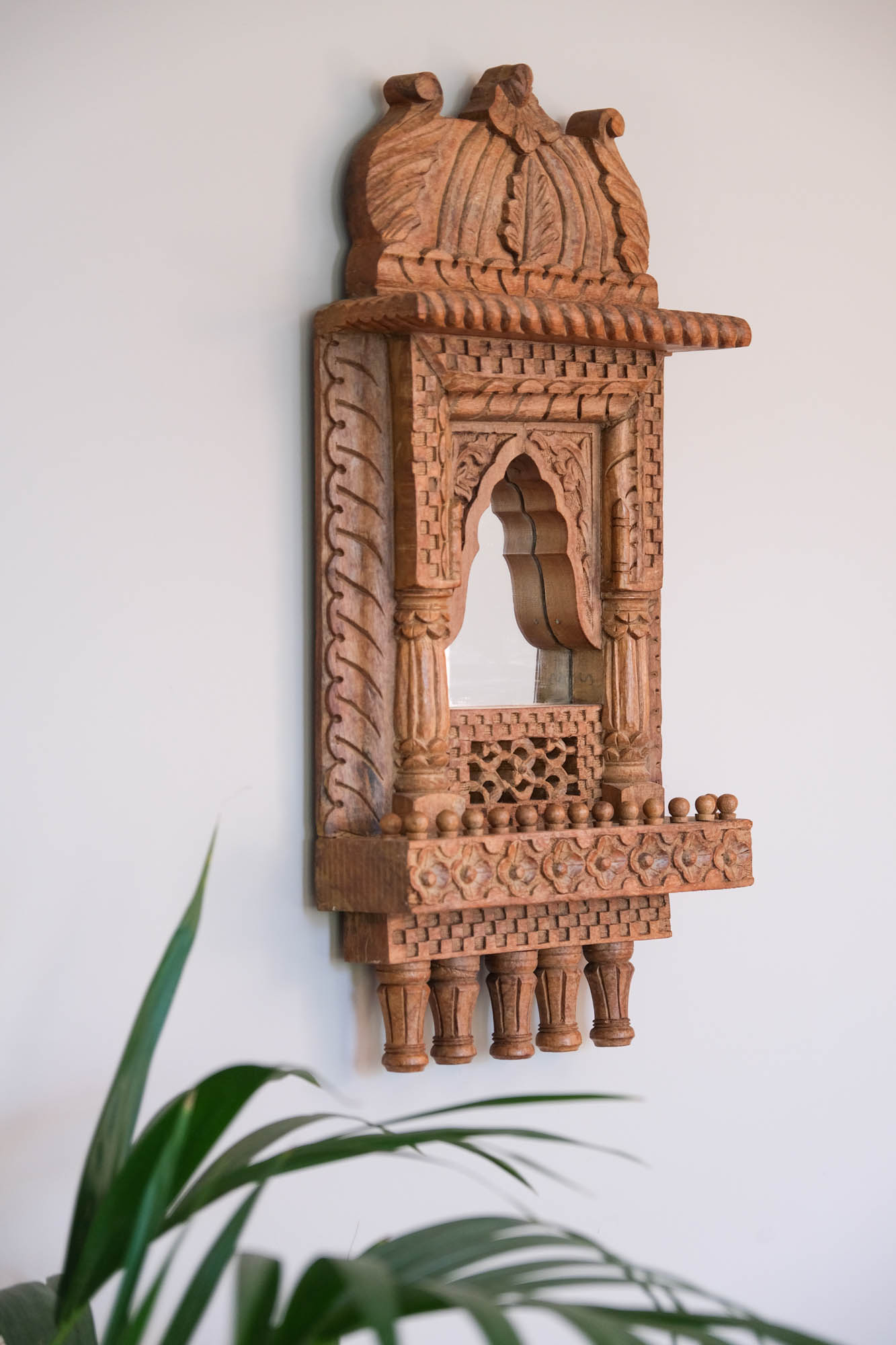 De houten spiegel aan de lange wand kochten we ooit tijdens een vakantie op een vlooienmarkt in Rouen. Al die tijd lag hij te verstoffen in de garage, maar nu heeft hij eindelijk zijn plekje in huis gevonden. De houten bank eronder hebben we al heel lang en verhuisde van onze zolder naar de living. De interieurboeken die er nu op liggen, blader ik vaak door om interieurinspiratie op te doen.