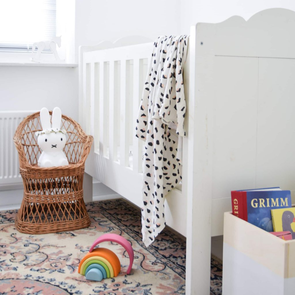 Bewaar speelgoed in rotan of rieten manden voor een opgeruimde gypsy look in je babykamer. Je kunt er ook voor kiezen om een mooie hangplant of balletjes slinger langs je kast te hangen. Ik ben nog even op zoek naar iets leuks voor naast de kast, maar dat komt vast snel goed.